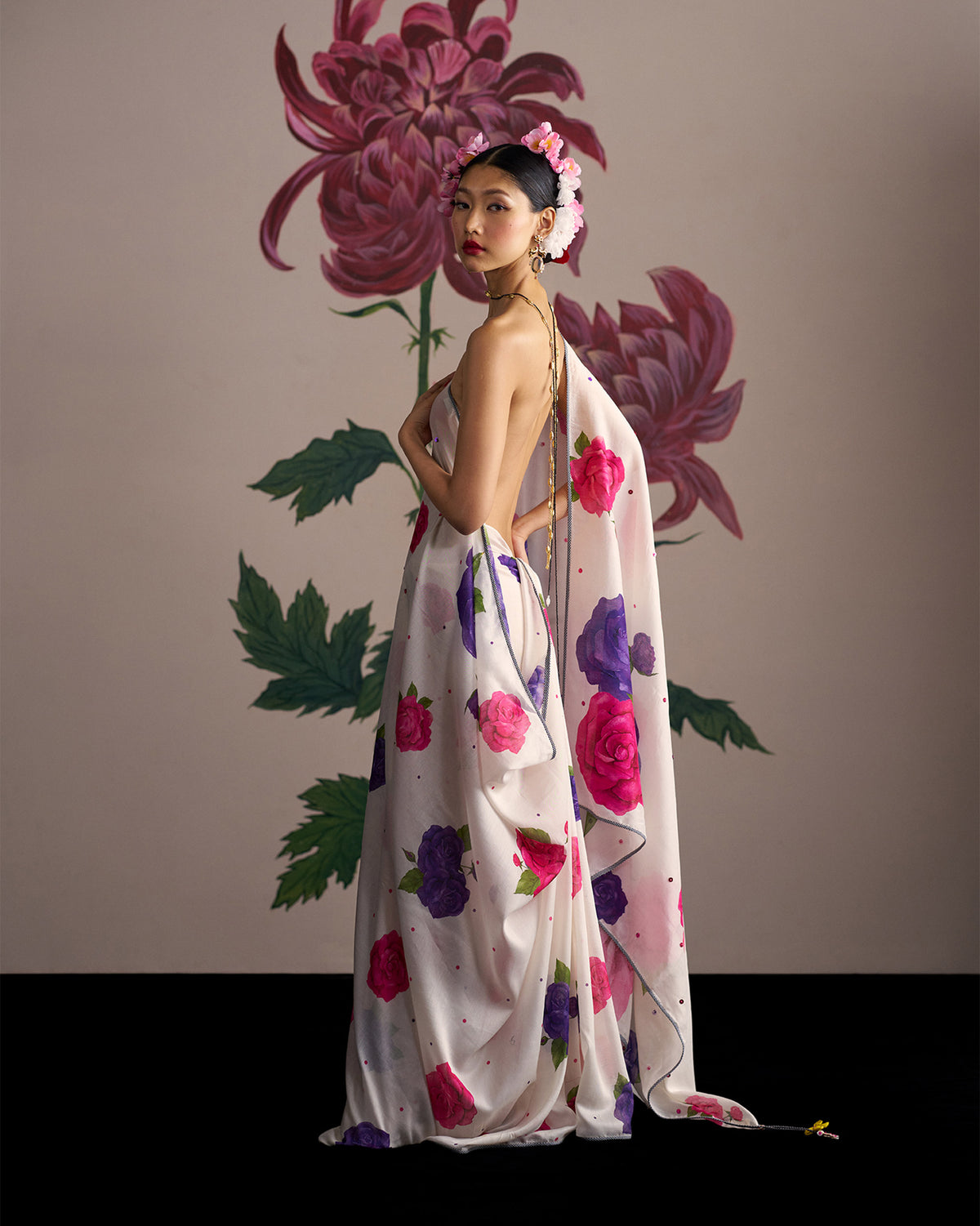 - Ethereal and understated, the Gul Sari in ivory is an ode to quiet craftsmanship and timeless design. Crafted from fine Chanderi, a cotton-silk blend known for its delicate texture and gentle sheen, the ivory base is brought to life with vivid purple-fuchsia floral motifs, delicately scattered across the fabric.