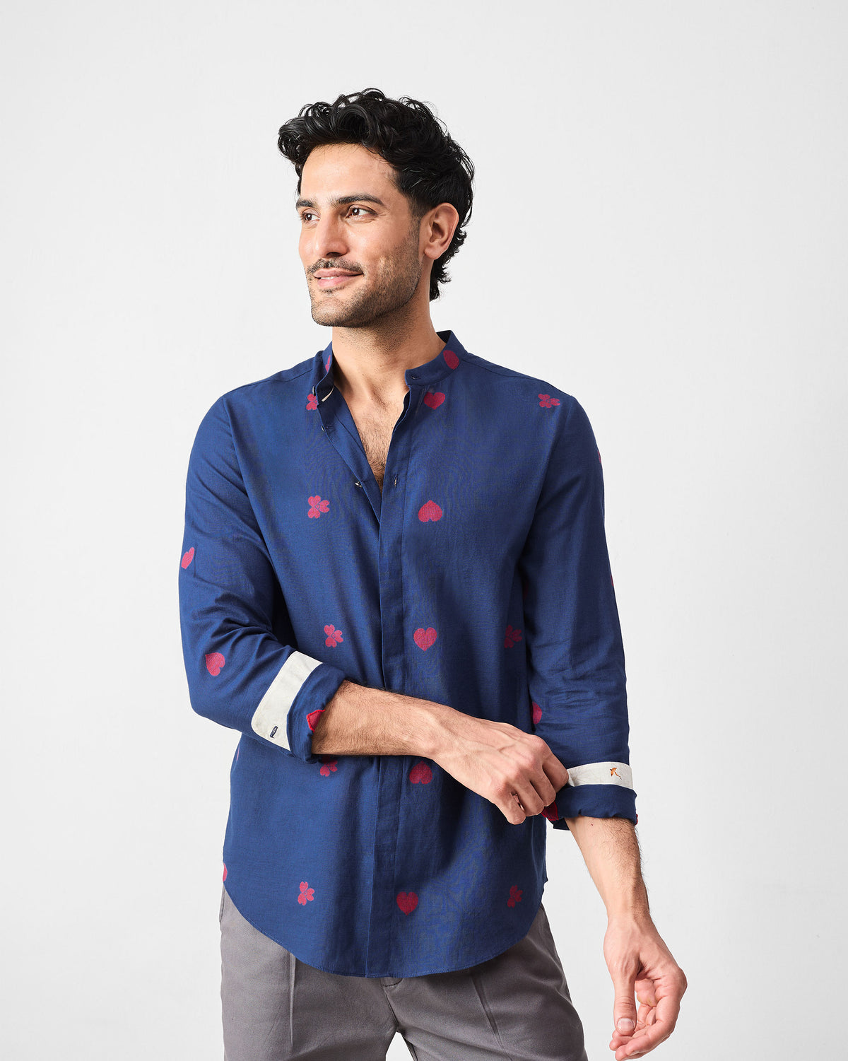- Crafted in navy and red jamdani, it’s speckled with hearts, clovers, and dots—and finished with a playful red star button at second from top.