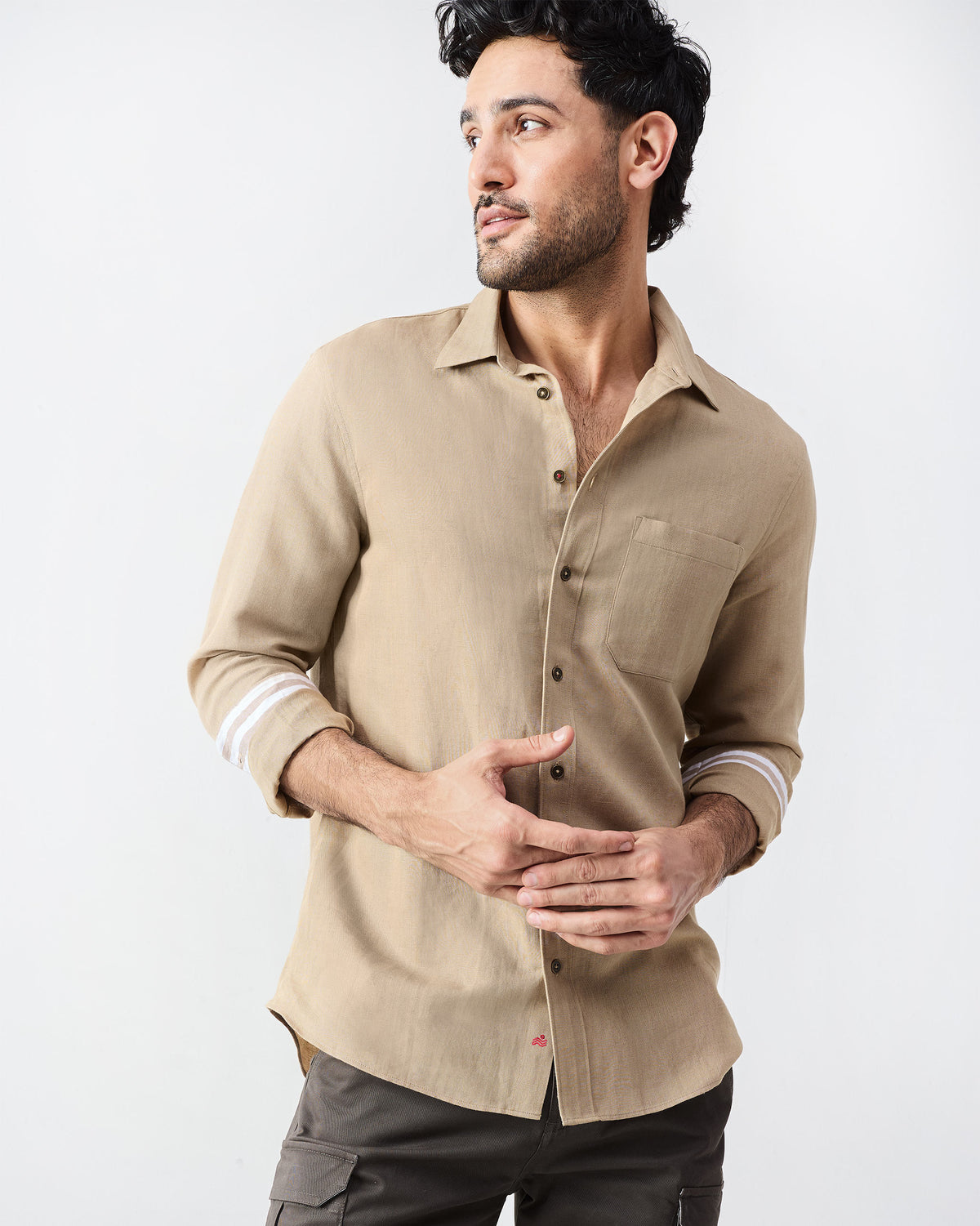 - Cut from a breathable linen-cotton blend in solid khaki, with travel twill tape tucked inside the neckband, and subtle red accents—a star at the sleeve placket and a bold second button on the front.