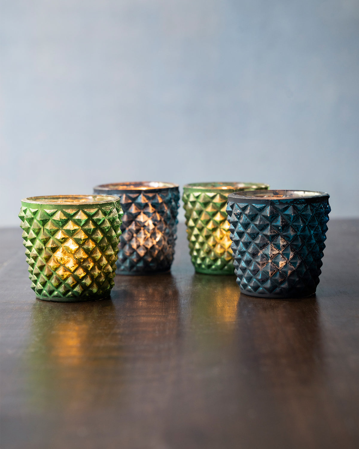 - Glass votives in tints of celadon and indigo ( with silver higglights), these look particularly festive when placed as a cluster on tabletops or mantlepieces