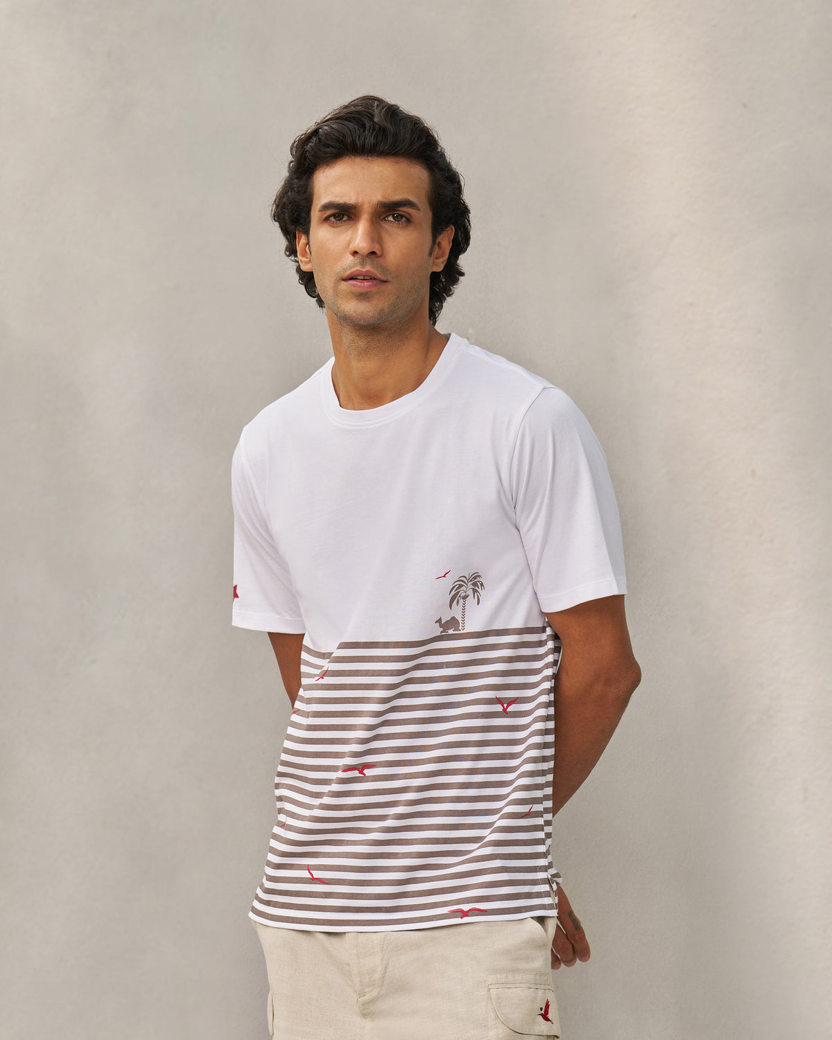 - The Moroccan Palm T-shirt features two halves of prints: starting with a resting camel below a palm tree and going into stripes. The white tee features silhouettes of birds in red all over.