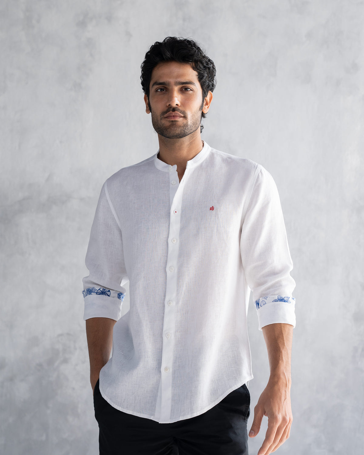 - Our token to tradition: this Nehru collar shirt is crafted in soft cotton-linen blend and comes in a slim fit.