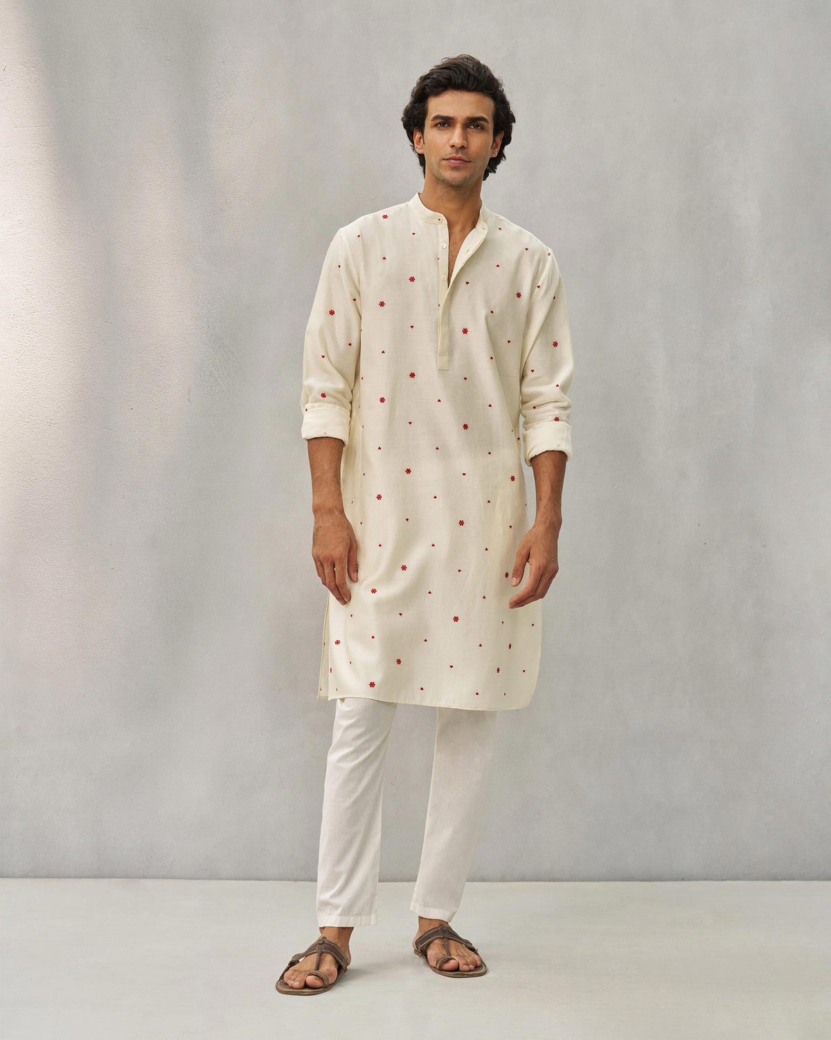 - A full-sleeve, classic bandhgala kurta for special times with subtle all-over embroidery heart and flower detail.