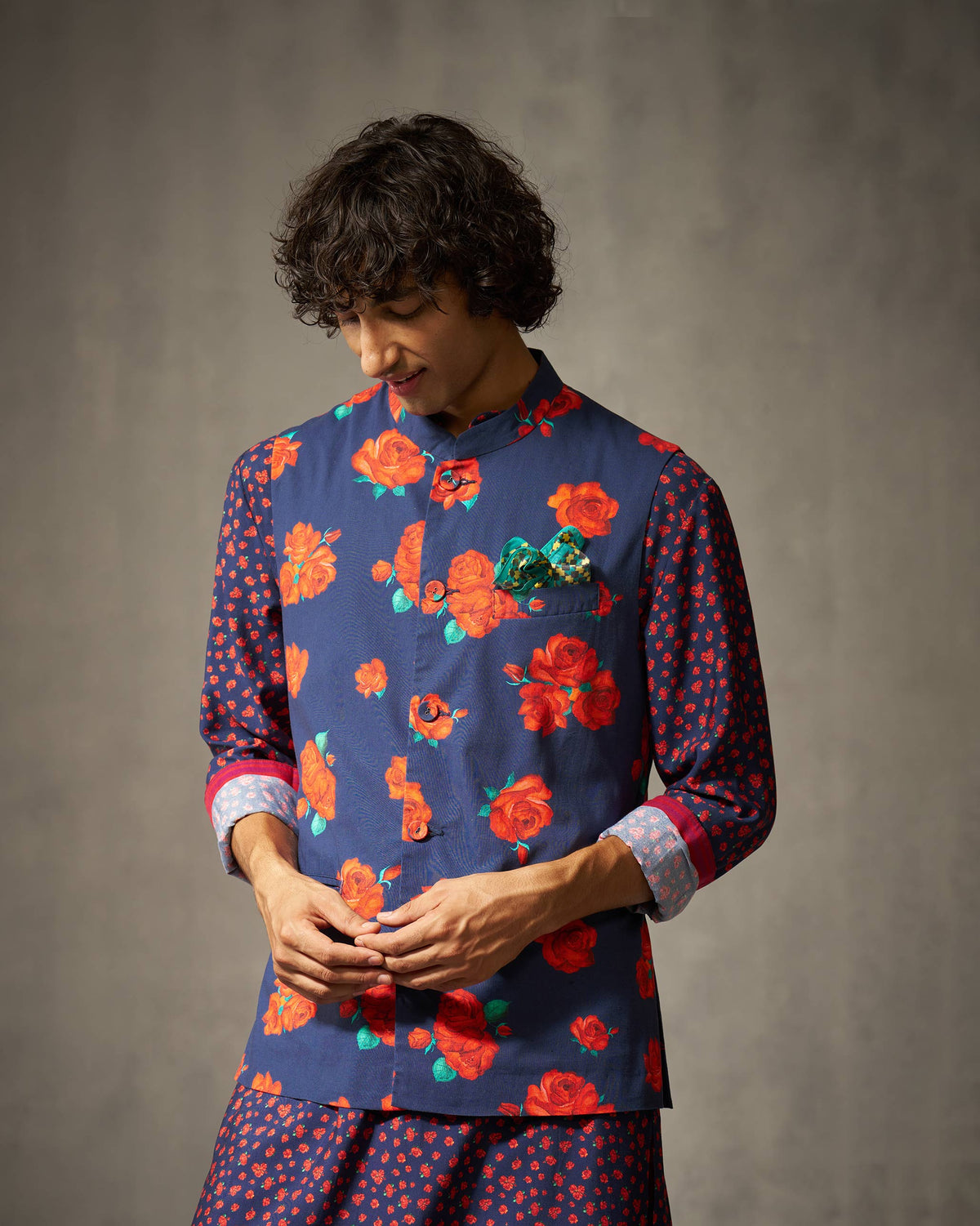 - Our token to tradition in our menswear collection, this Nehru jacket is crafted in comfortable cotton linen and features a striking rose print all over. The roses are inspired by our travels to Morocco, symbolizing love, beauty, and purity, and are prominently featured in weddings, festivals, and religious ceremonies.