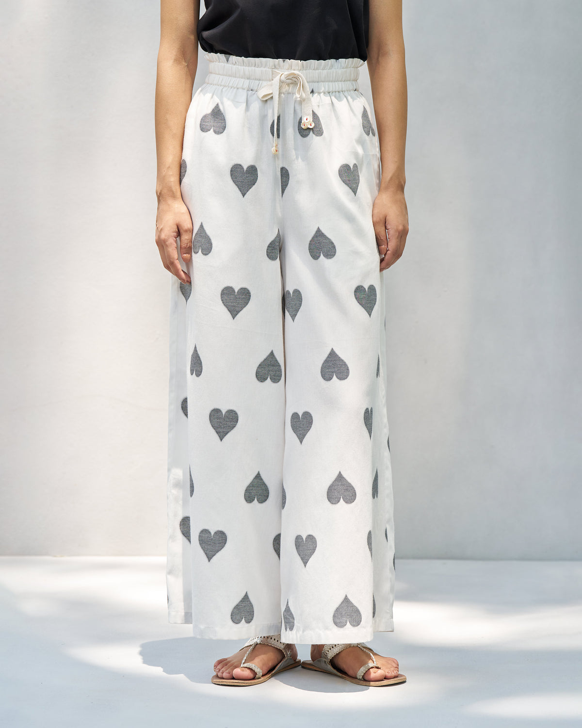 - These flare pants feature a comfy paper-bag waistband to seamlessly fit into with sweet hearts all over.