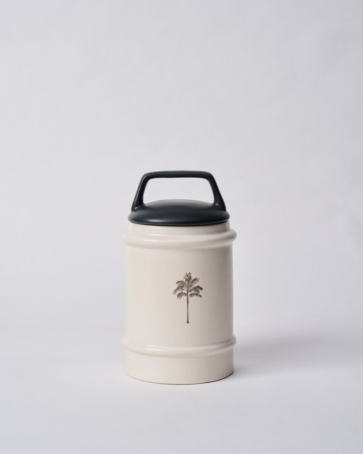 - Crafted in stone with an ivory finish and printed with a lone palm, our barnis can be used to store dry ingredients like candles and spices