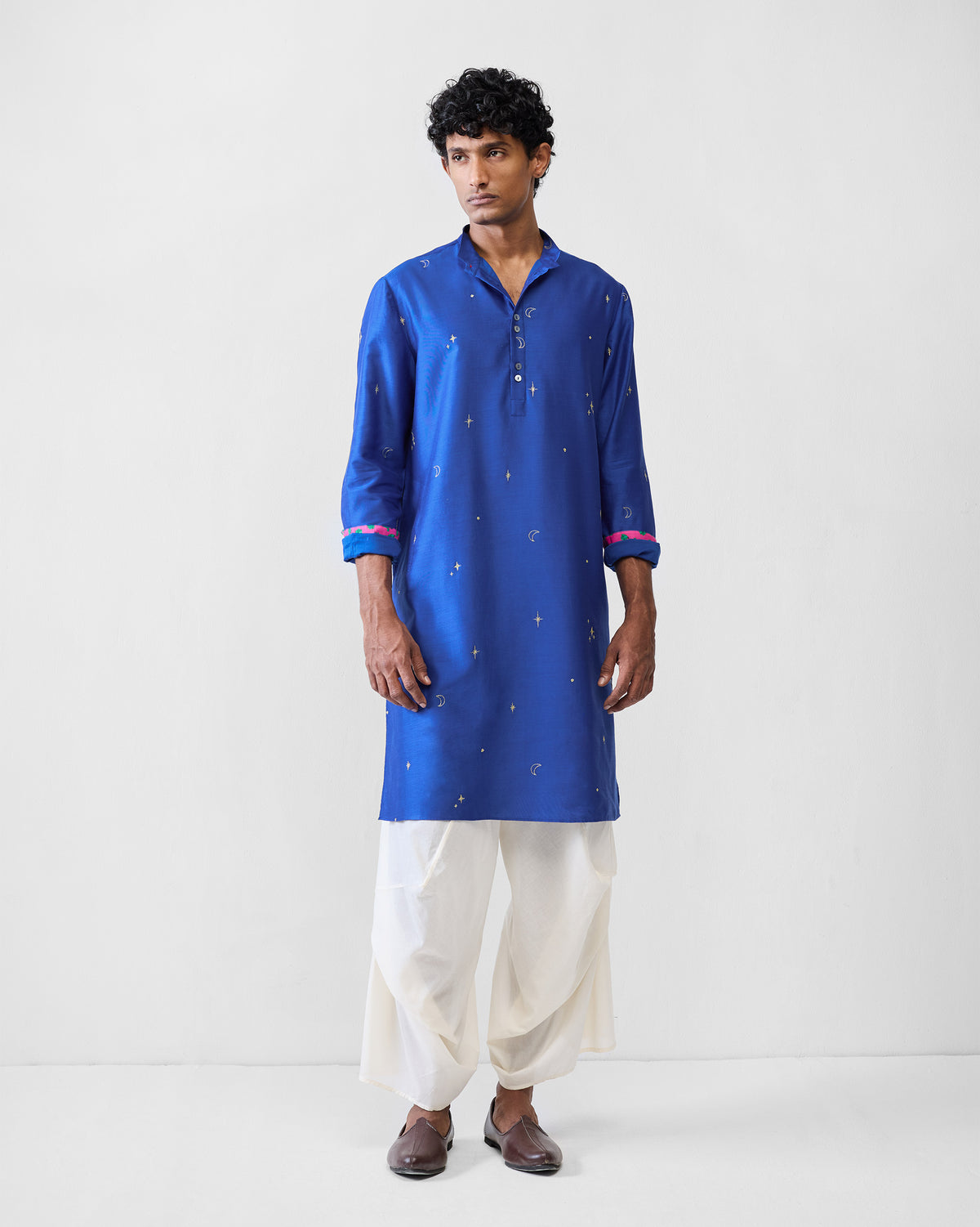 - The Rey Kurta draws on celestial motifs, its navy surface scattered with delicate moon embroideries that catch the eye in subtle rhythm. Refined yet festive, it’s a piece designed for nights of gathering and celebration.