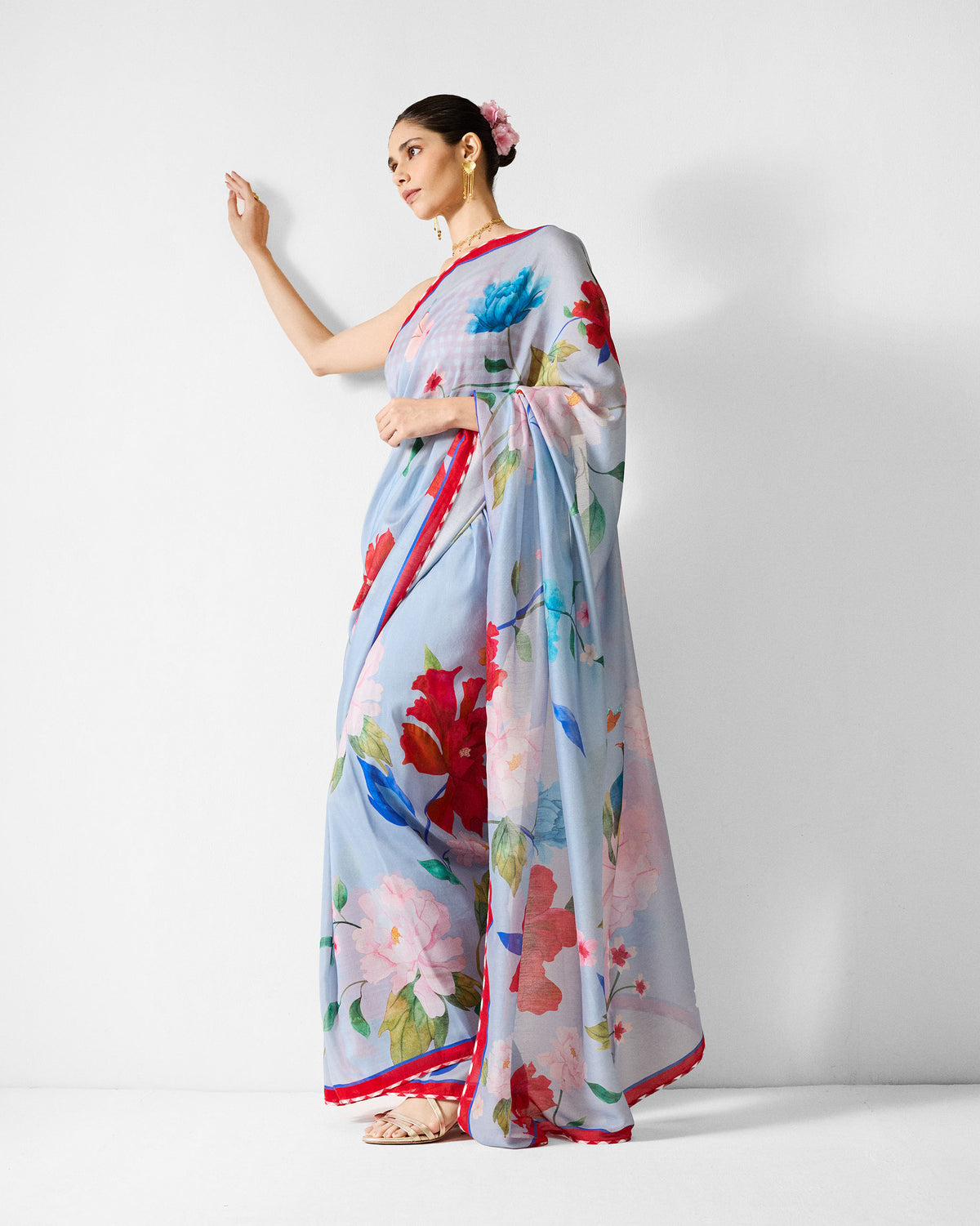 - Softly poetic, the Roop Sari blends is woven from fine Chanderi — a lightweight cotton-silk blend known for its luminous finish. This sari features a serene light blue base adorned with an intricate oriental-inspired print.