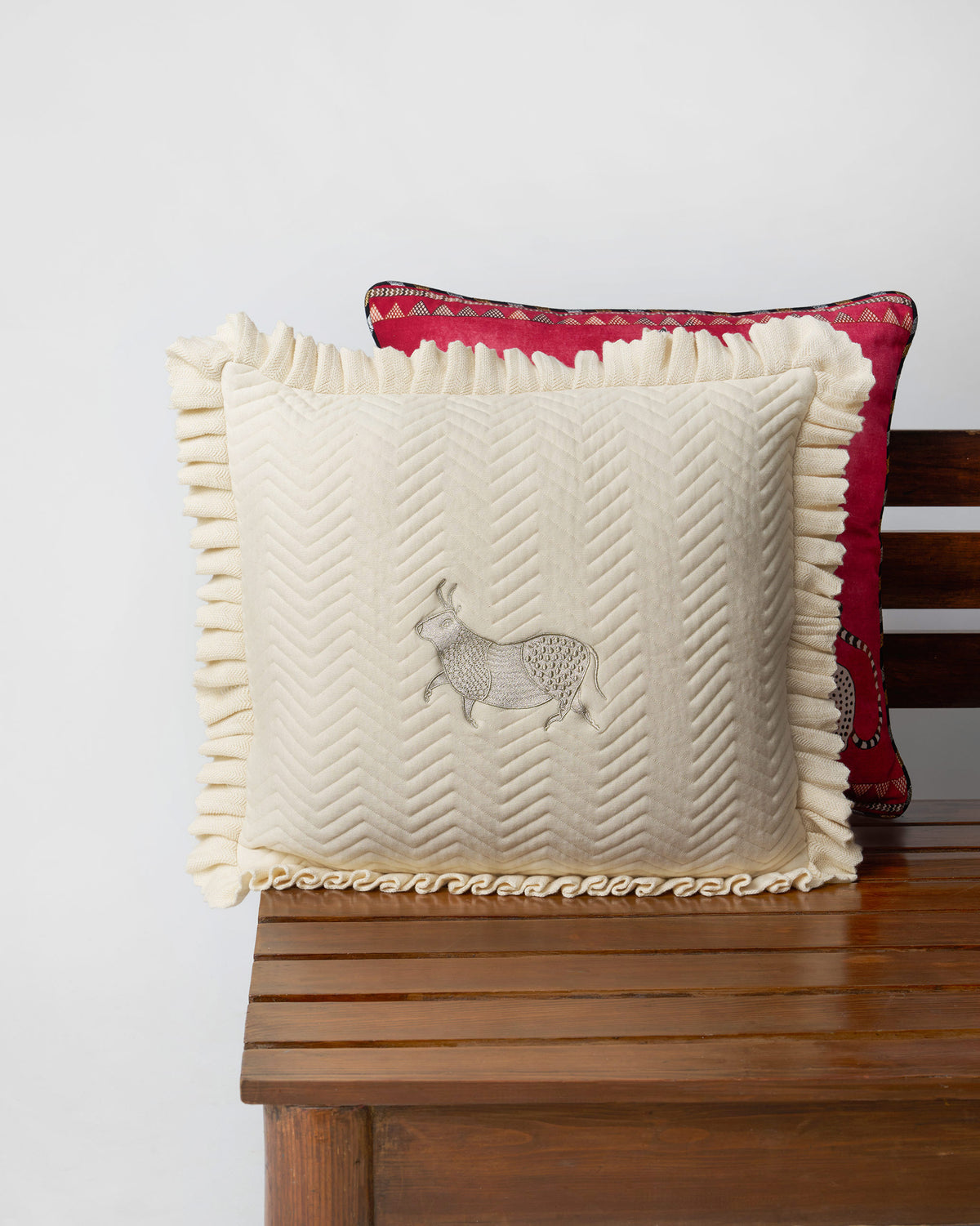 - Inspired by motifs from the Indus Valley, the Bull Cushion Cover celebrates strength and heritage through intricate silver and gold zari embroidery.