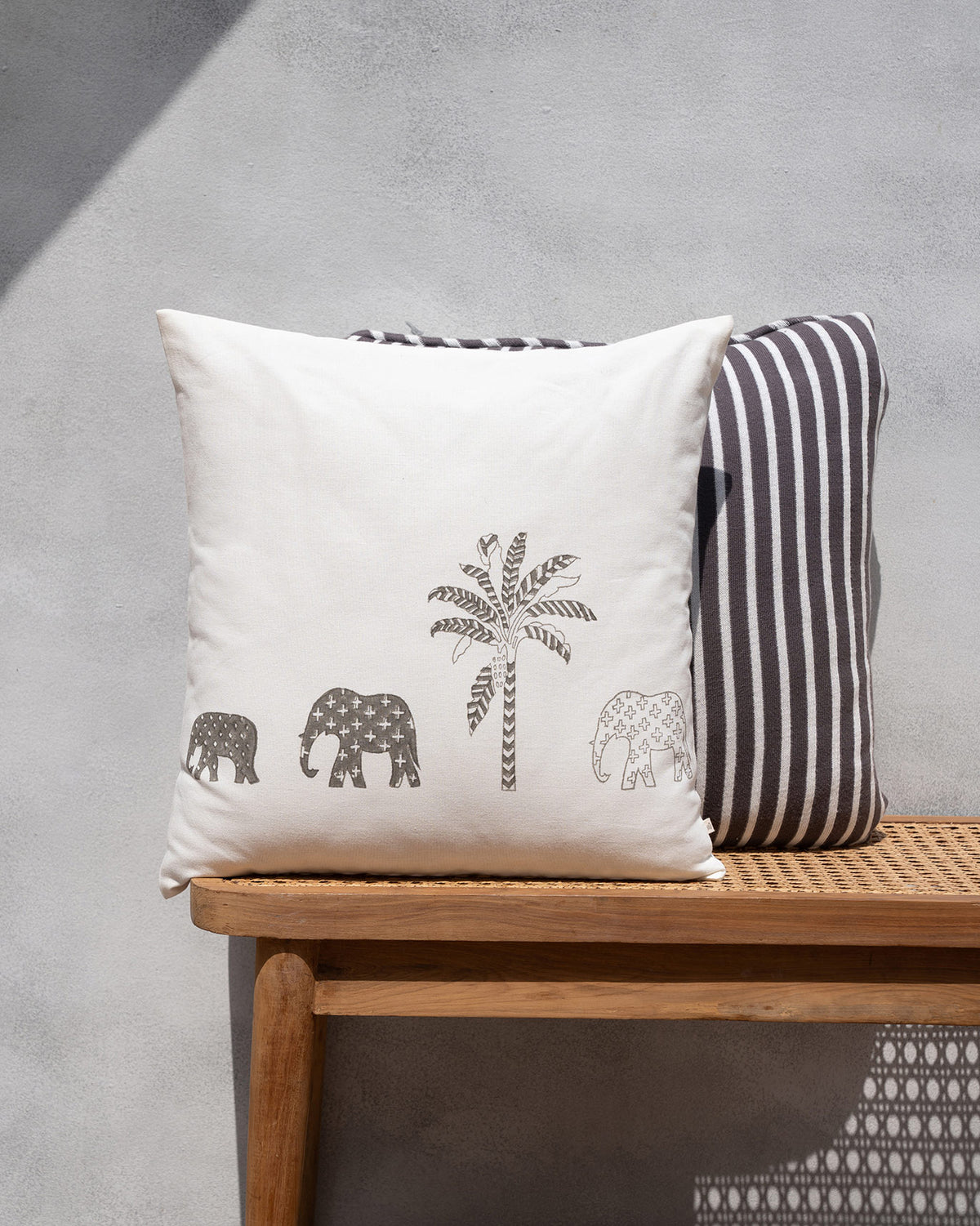 - Perfect to dress up a bed, a rug-kitted corner, or a diwan, this ivory cushion cover features palm trees and a parade of marching elephants as an ode to the tropics