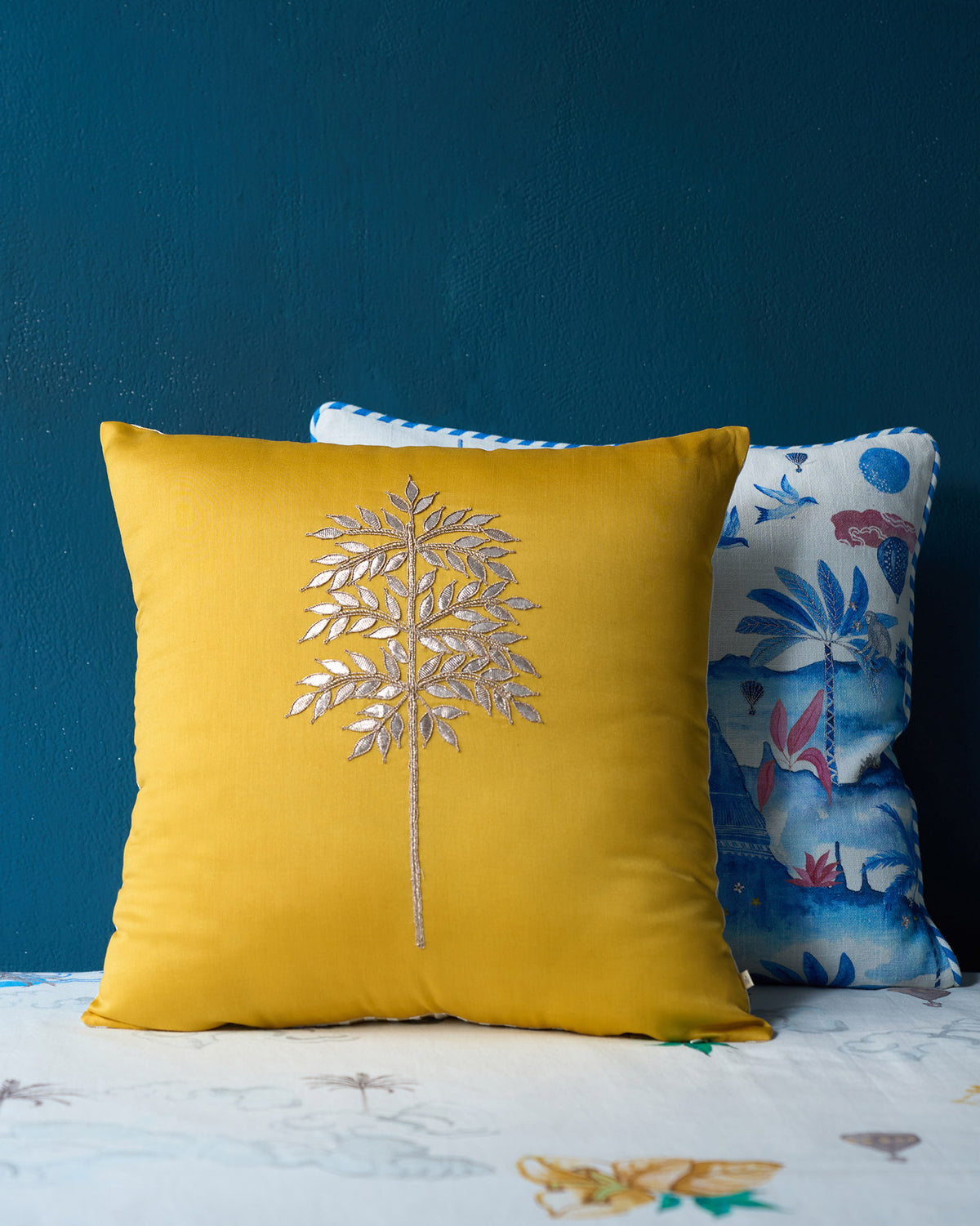 - This yellow cushion cover is a celebration of Rajasthan's traditional embroidery forte: the craft of gota patti; Appliquéd metallic ribbons are delicately folded and hand embroidered onto the fabric