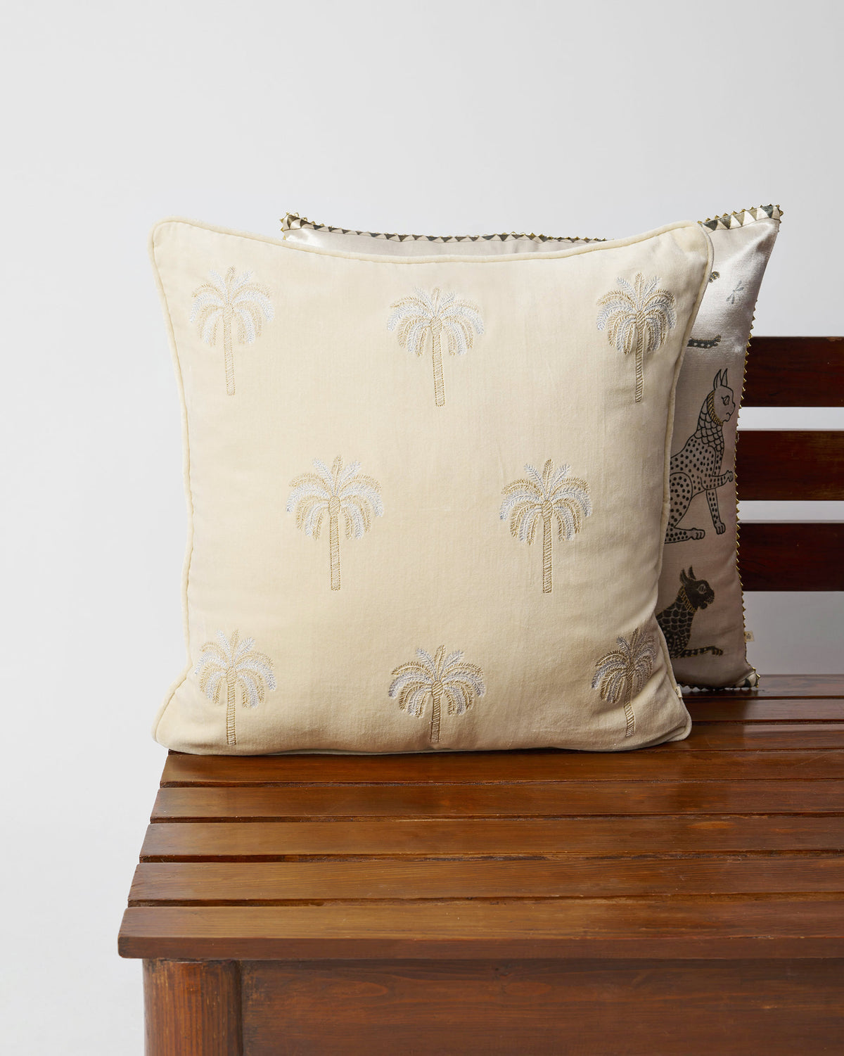 - A subtle nod to the tropics, the Palm Shimmer Cushion Cover features delicately embroidered palm motifs.The soft ivory tone adds warmth and sophistication, making it a timeless accent for any space.