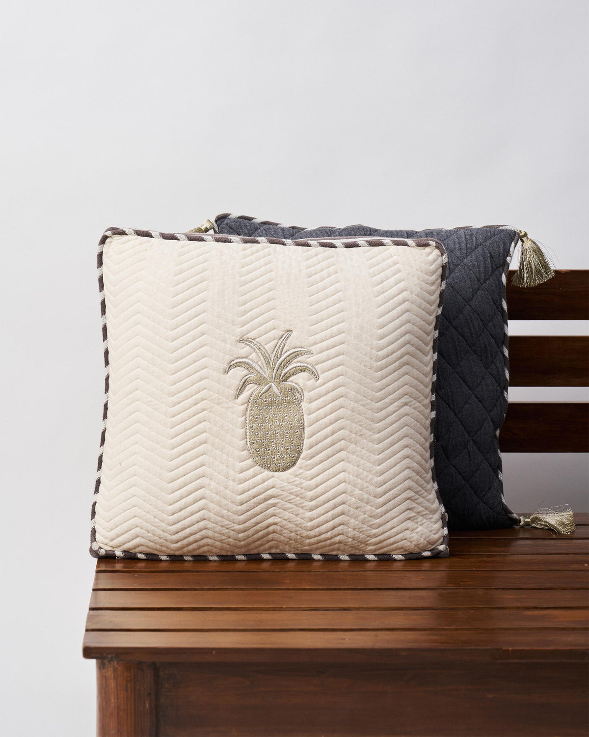 • Bring home the spirit of celebration with the cosy Quilted Ananas Cushion Cover with an embroidered pineapple motif that’ll fit into any corner of your home with its neutral colours. Finished with black and white piping, this cushion adds a classic charm to settings.