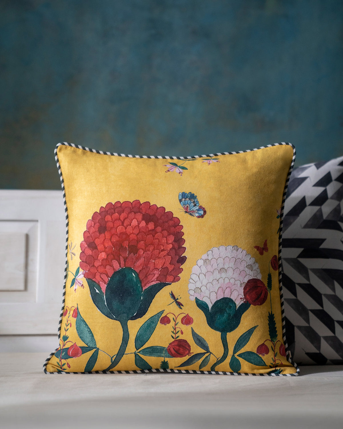 - Bring home some flourish with this digi-printed, peony-inspired cushion cover in durable mustard cotton duck, plus a stylised stripe back