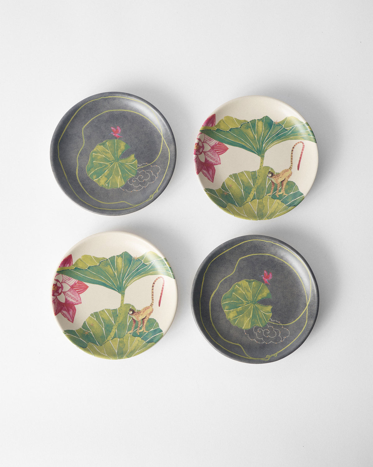 - One plate features a soft grey base with a single lily pad drifting across, while the other contrasts with a crisp white ground, lush green leaves, playful monkeys, and blooming lotuses finished with hints of gold.