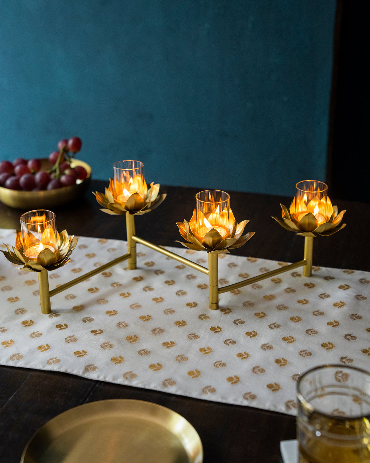 - Crafted in aluminium, sturdy glass and iron, this tea light holder features a beautiful lotus design, inspired by the terrains of the snow-laden Himalayan highlands