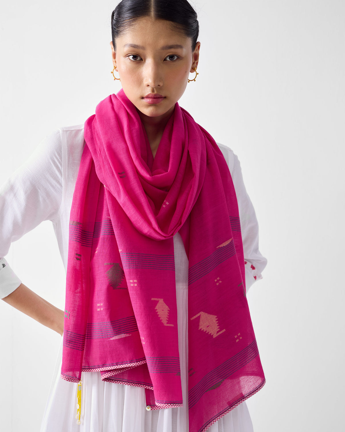 - Bold, bright, and handwoven—the Lumen Scarf in fuschia is your dose of mood-lifting colour.