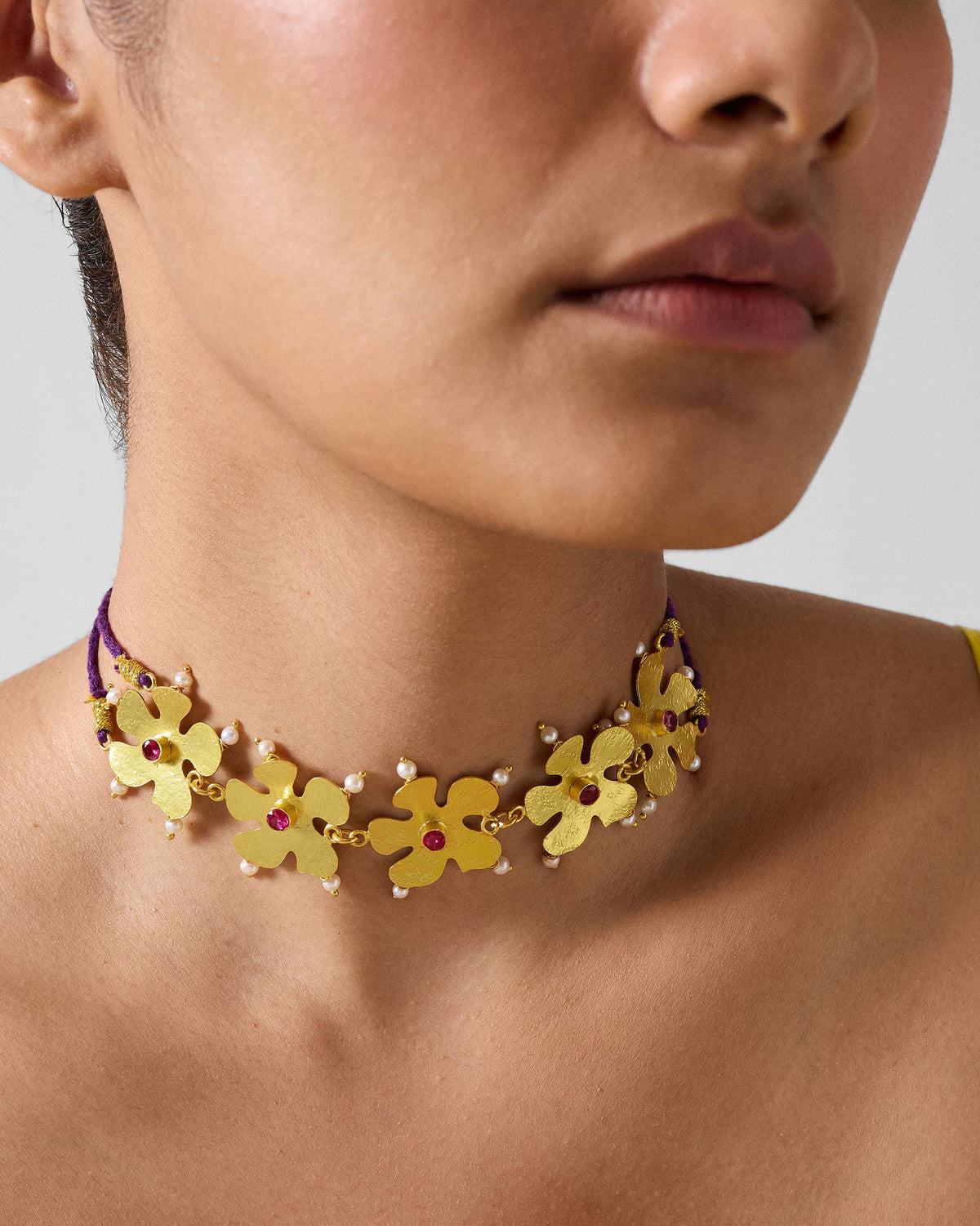 - Handmade with care, it is cast in brass and finished in gold for a rich, timeless appeal. Accented with red zircon stones and pearls, and secured with an adjustable resham thread, this necklace balances strength and elegance effortlessly touch of elegance to everyday moments.