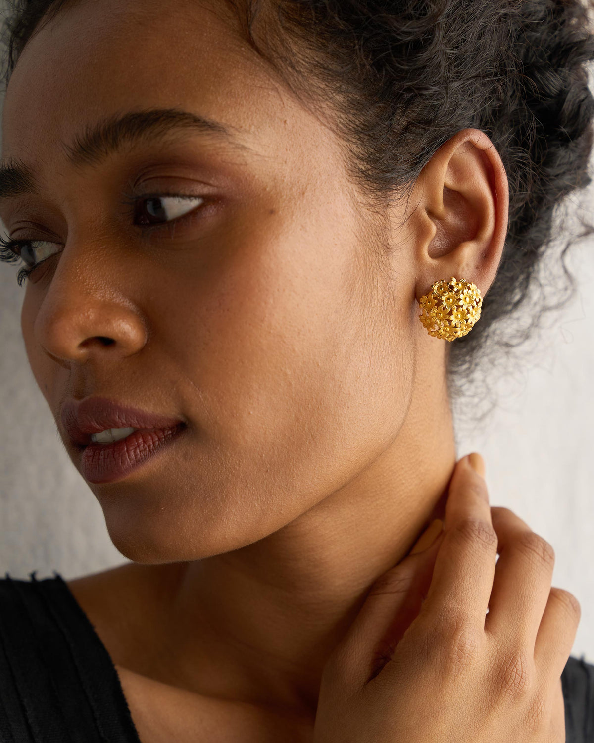 • Much like a bouquet of miniature flowers, these earrings are cast in brass and plated in gold.
