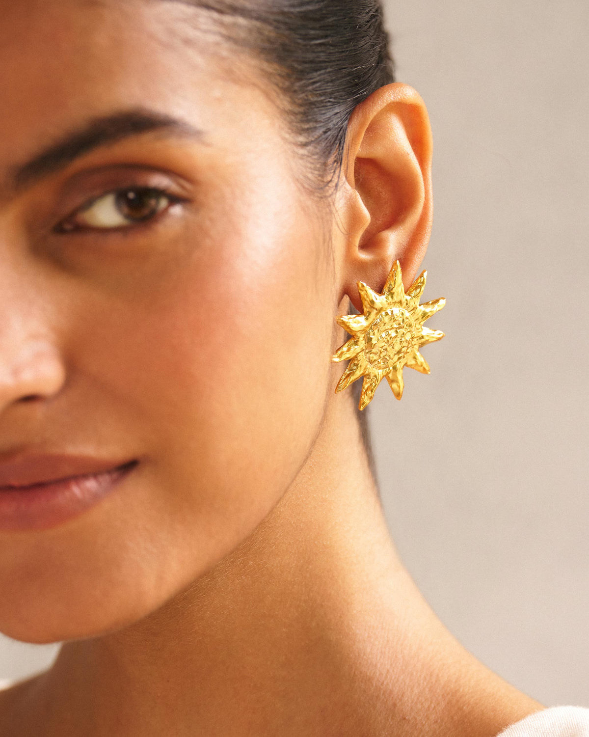 - Bold gleaming bits, these earrings are cast in brass, plated in gold, and feature statement sunflowers.