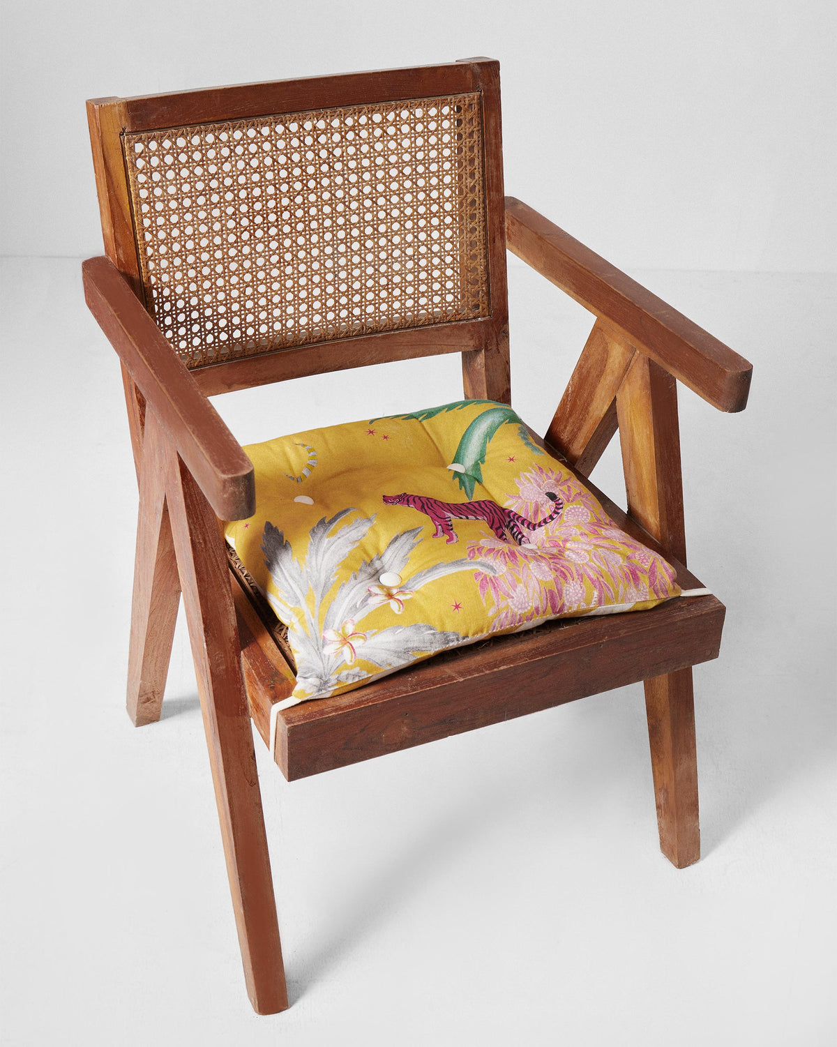 • Inspired by the rivers of India, which connect people, cities, and rituals, we turn inward to where it all began. The yellow Ceylon Lush Chair Cushion brings a sense of vibrancy and comfort to everyday living spaces with its print of a tiger gazing at the moon.