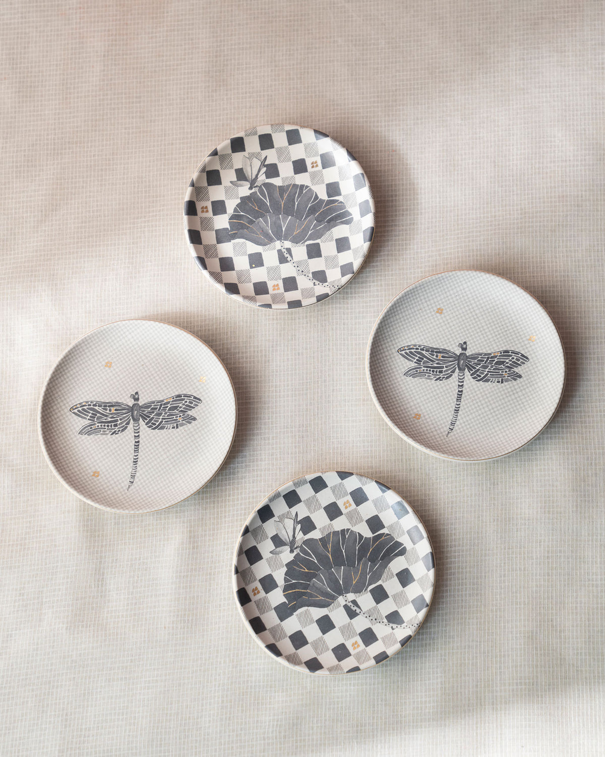 - A stoneware set of four tea plates in classic charcoal, and adorned & peppered with gold motifs that elevate