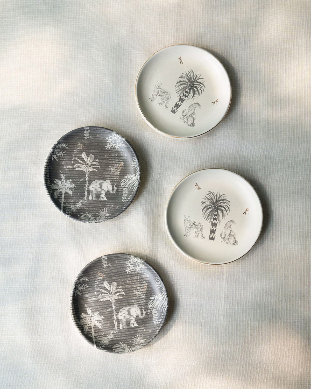 - Printed with motifs inspired by the Malabar Coast, this set of tea plates are crafted in smooth stoneware