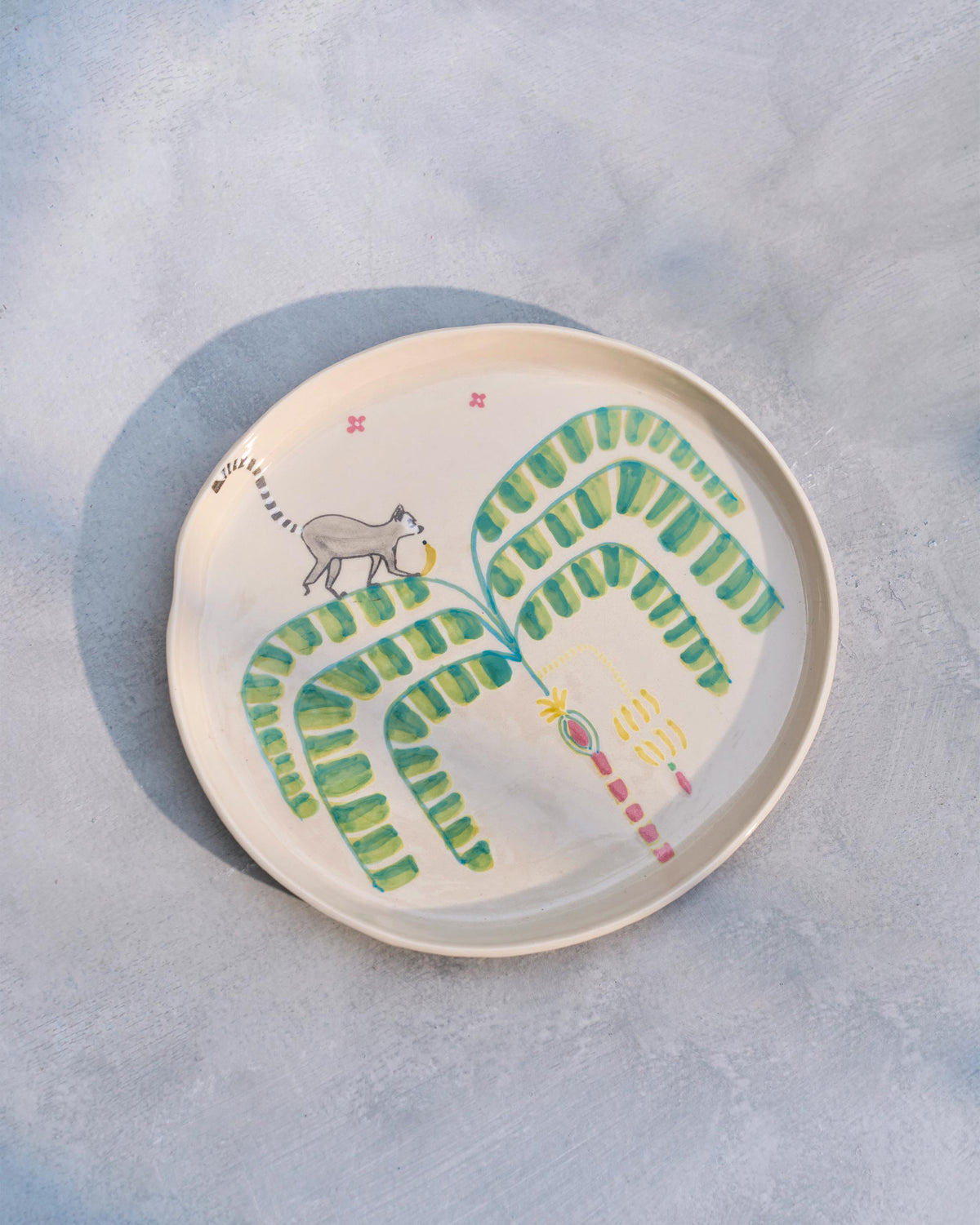 - Serve your sweet treats in style with the Safari Dessert Plate, featuring a delightful hand painted motif of a cheeky lemur leaping across three bright pineapples. This lightweight stoneware is a perfect addition to your tableware collection.