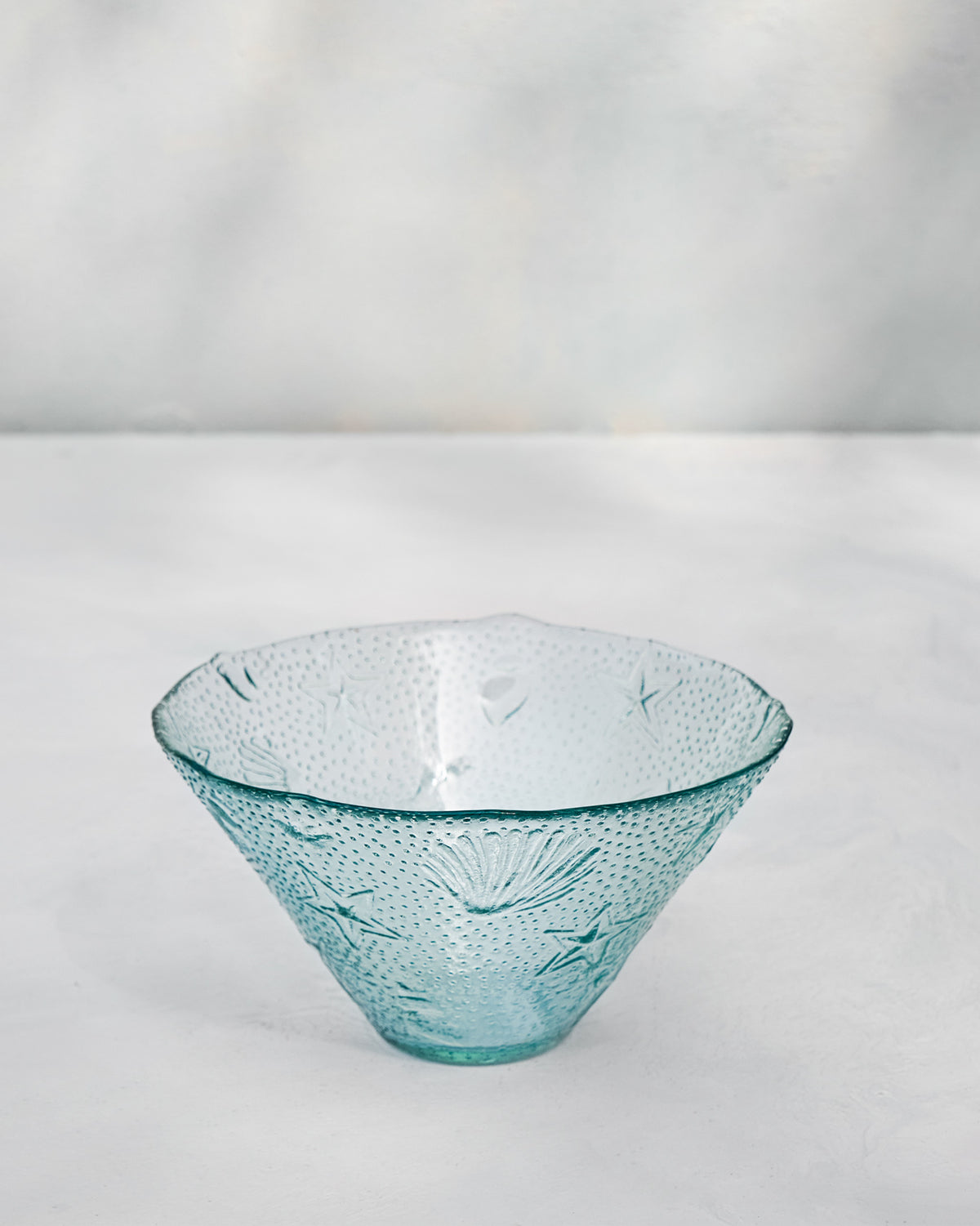 - The Shore snack bowl has a slight green tint, characteristic of recycled glass. It is made from 100% post consumer recycled glass.