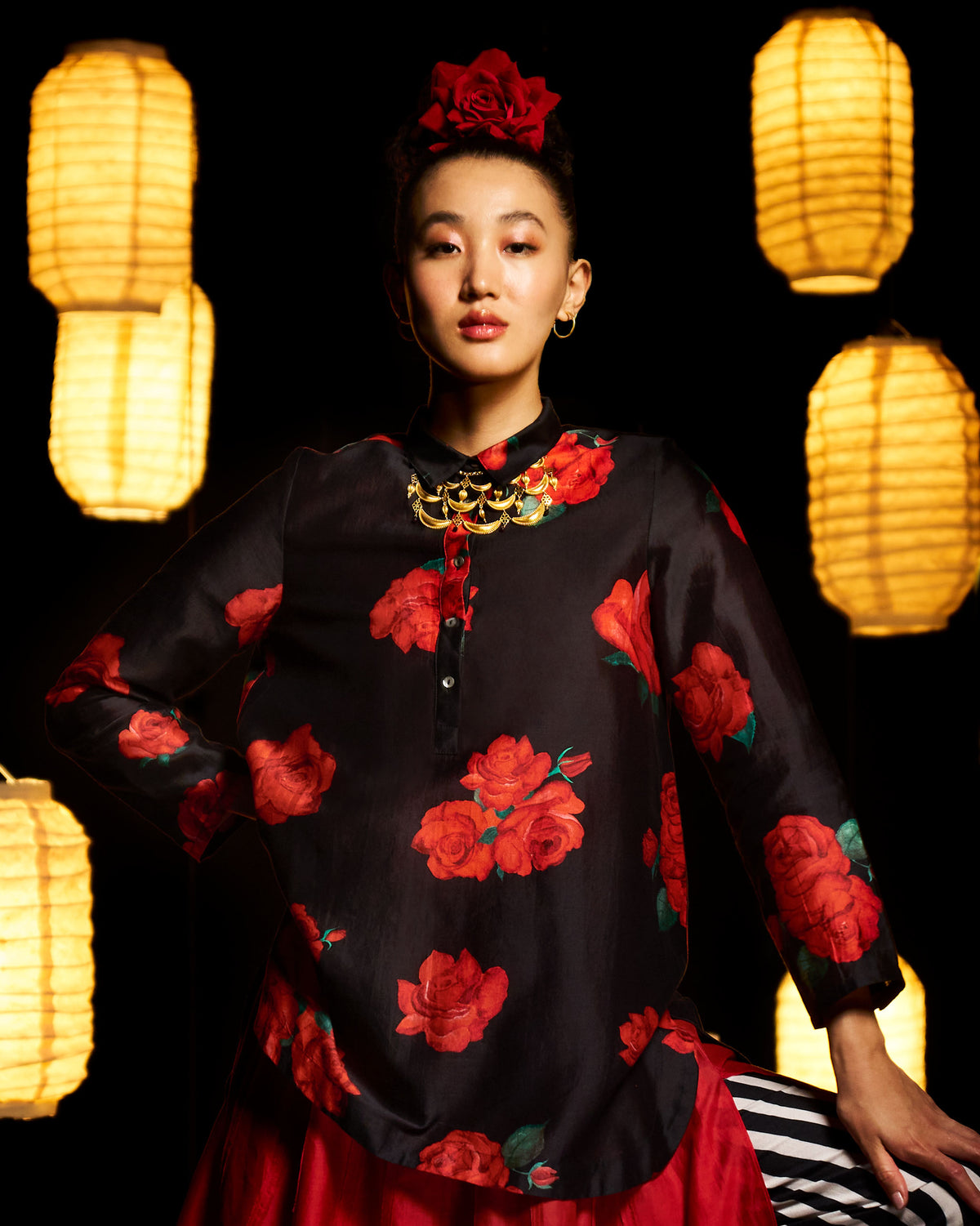 - The rich culture of Thailand is the inspiration behind Nicobar’s High-low shirt. The beautiful and bold print of red roses against a black background makes it perfect for festive soirees or date night.