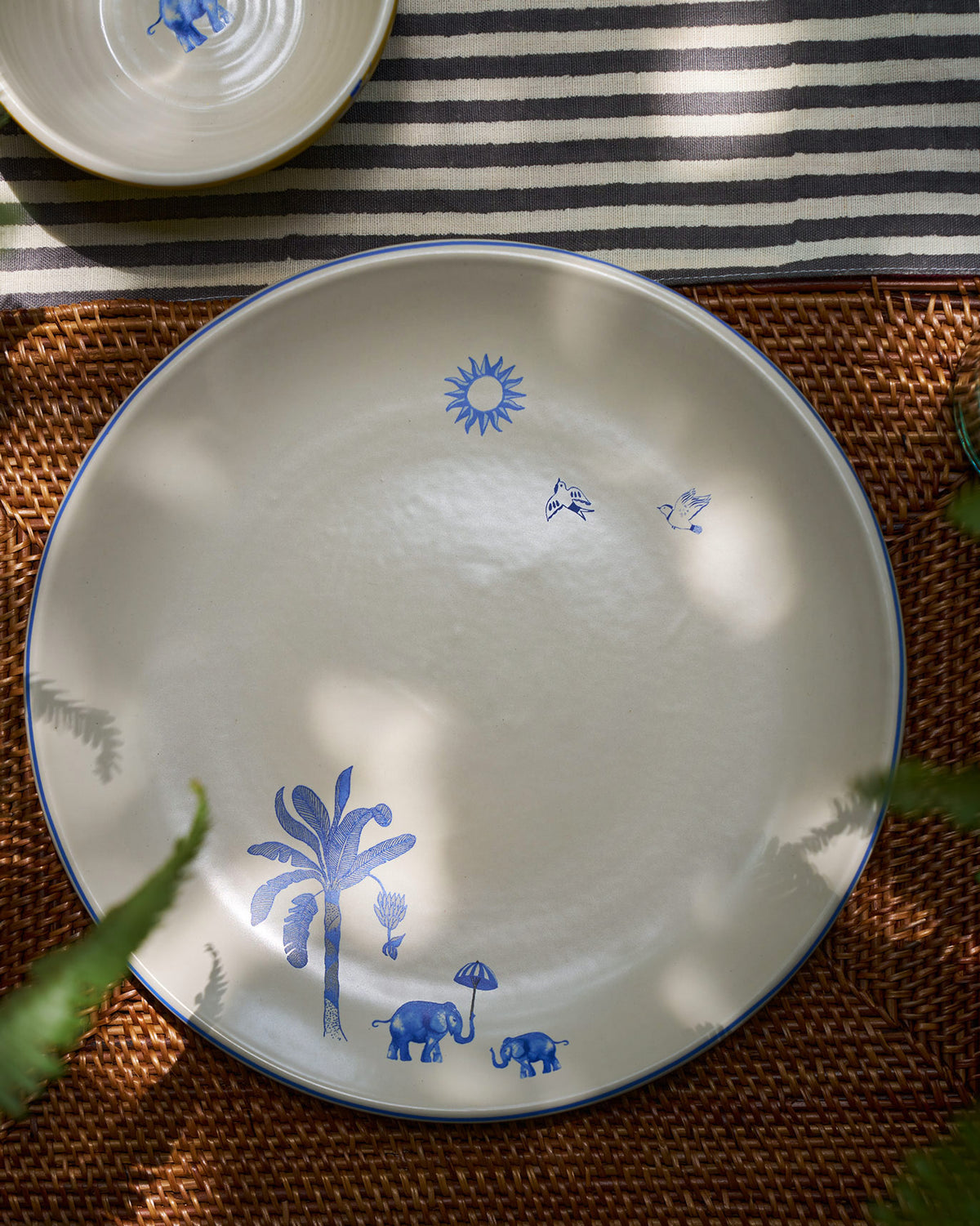 - The colour palette of the plate is indigo and ivory.