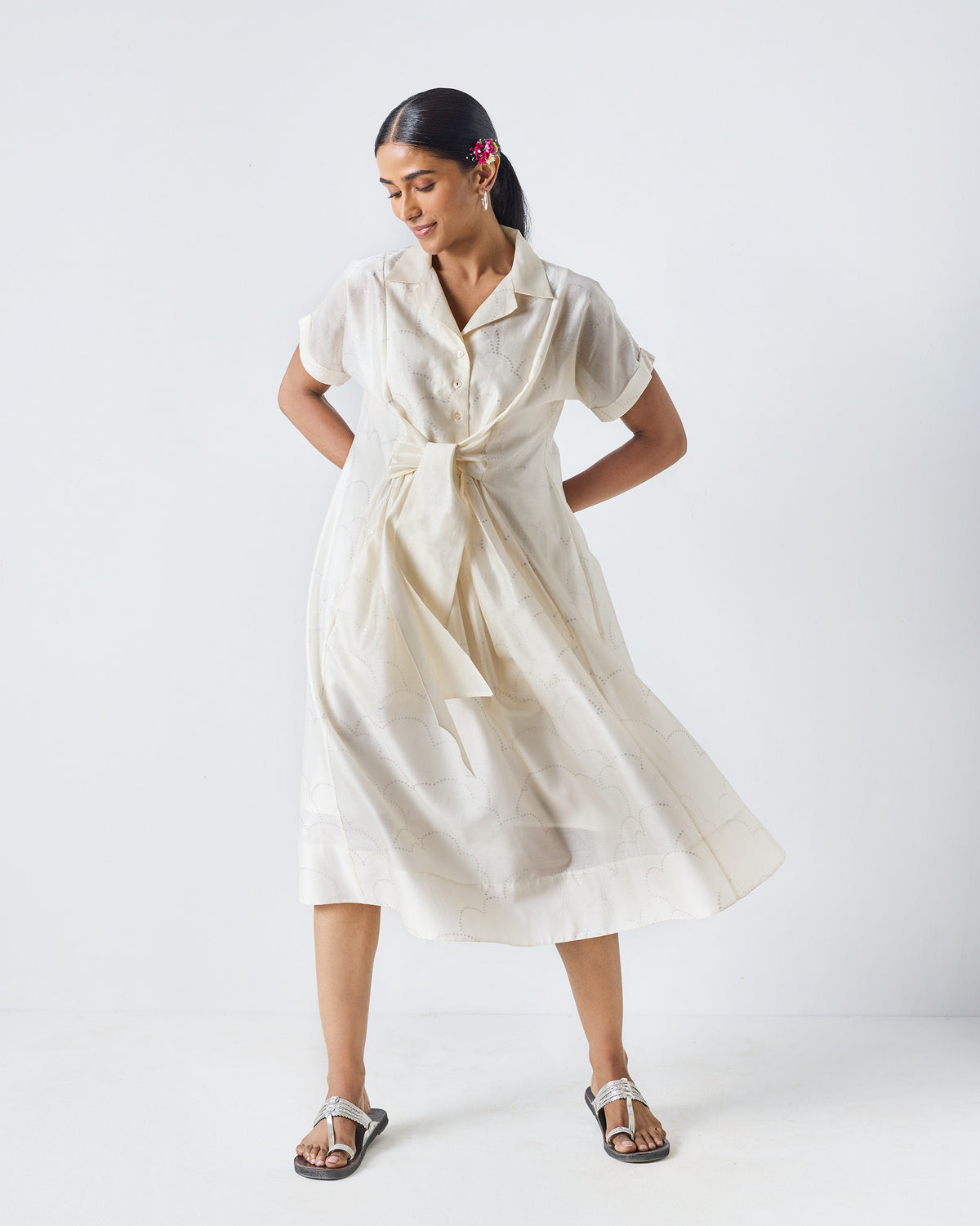 - The Cadeau Dress is crafted from luxurious cotton silk fabric, featuring a soft ivory base adorned with a shimmering silver cloud print, creating a serene, ethereal look.