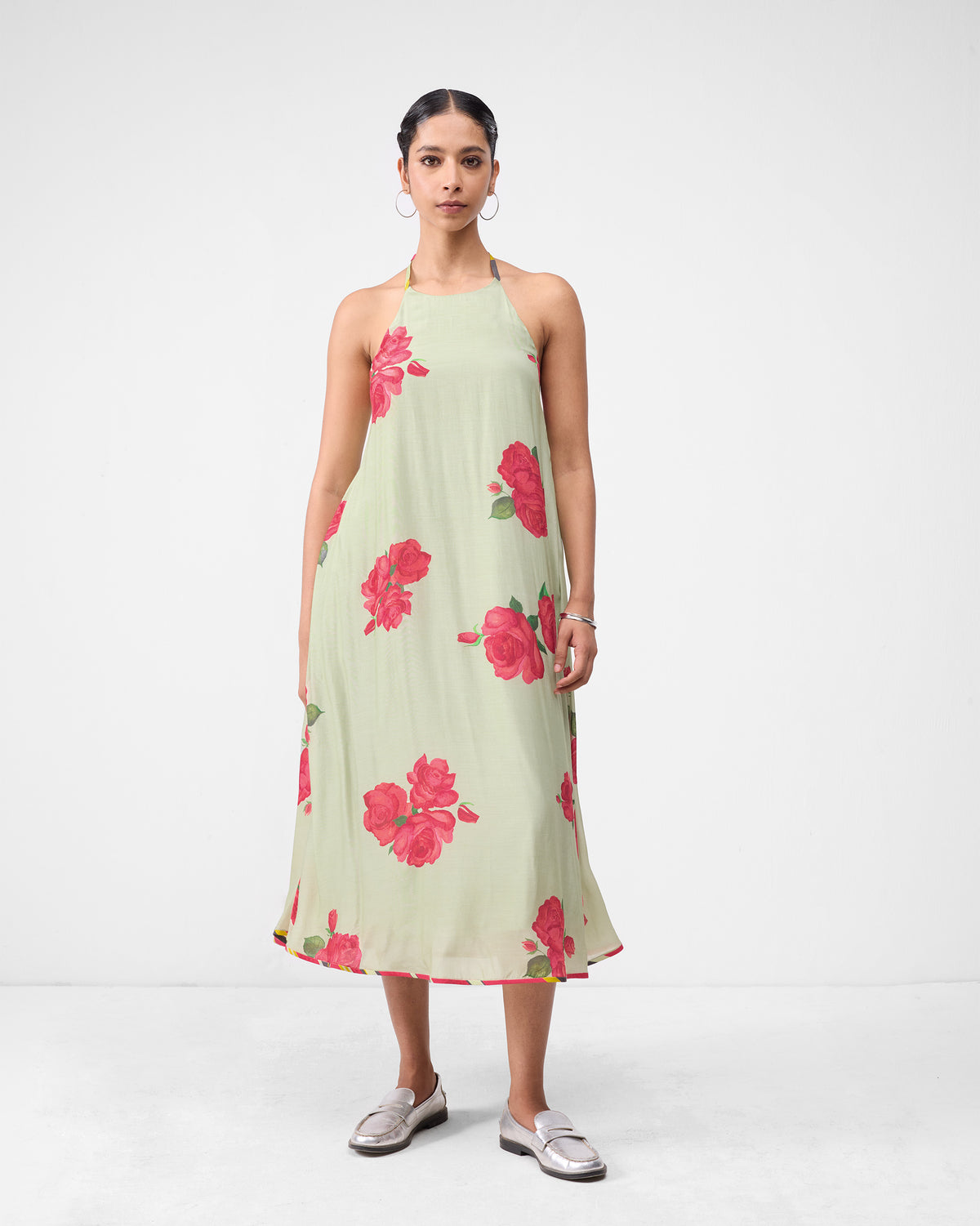 - Set against a mint base and made in Bemberg, the watermelon rose chintz adds colour and contrast, while the open back and smocking offer ease without losing shape.