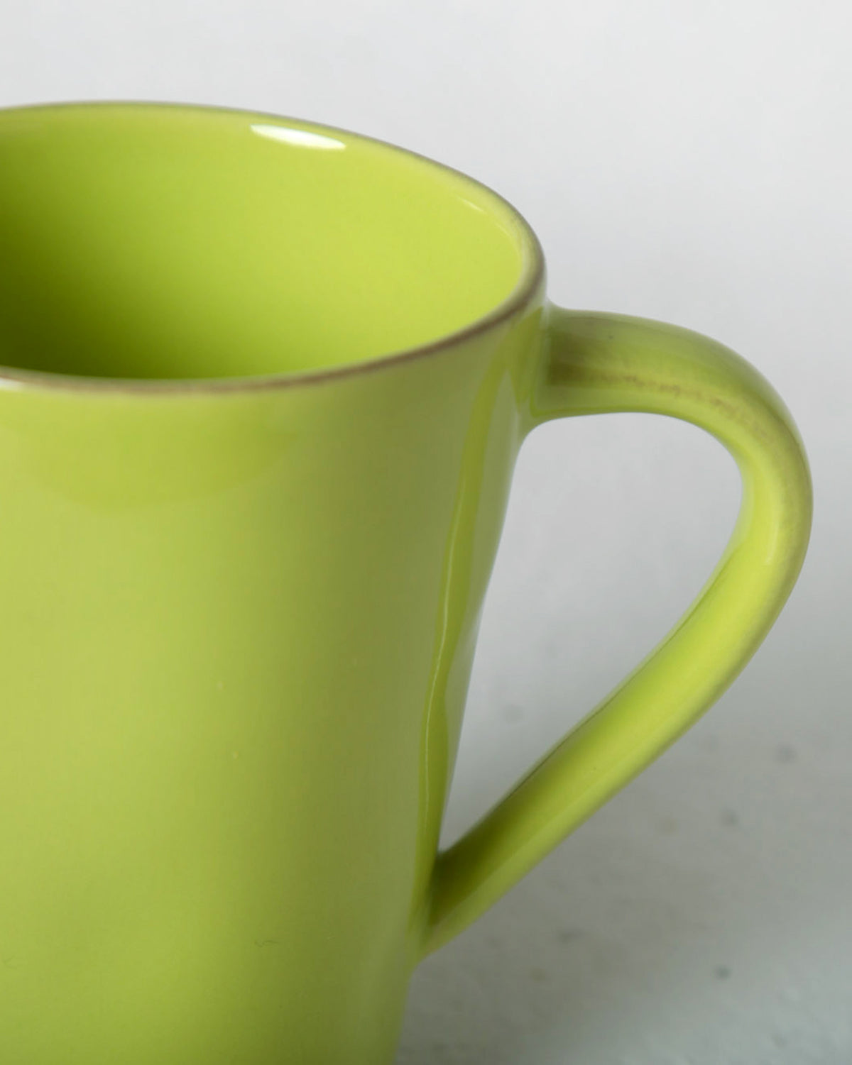 - This smooth, tall stoneware mug has an artisanal handmade shape