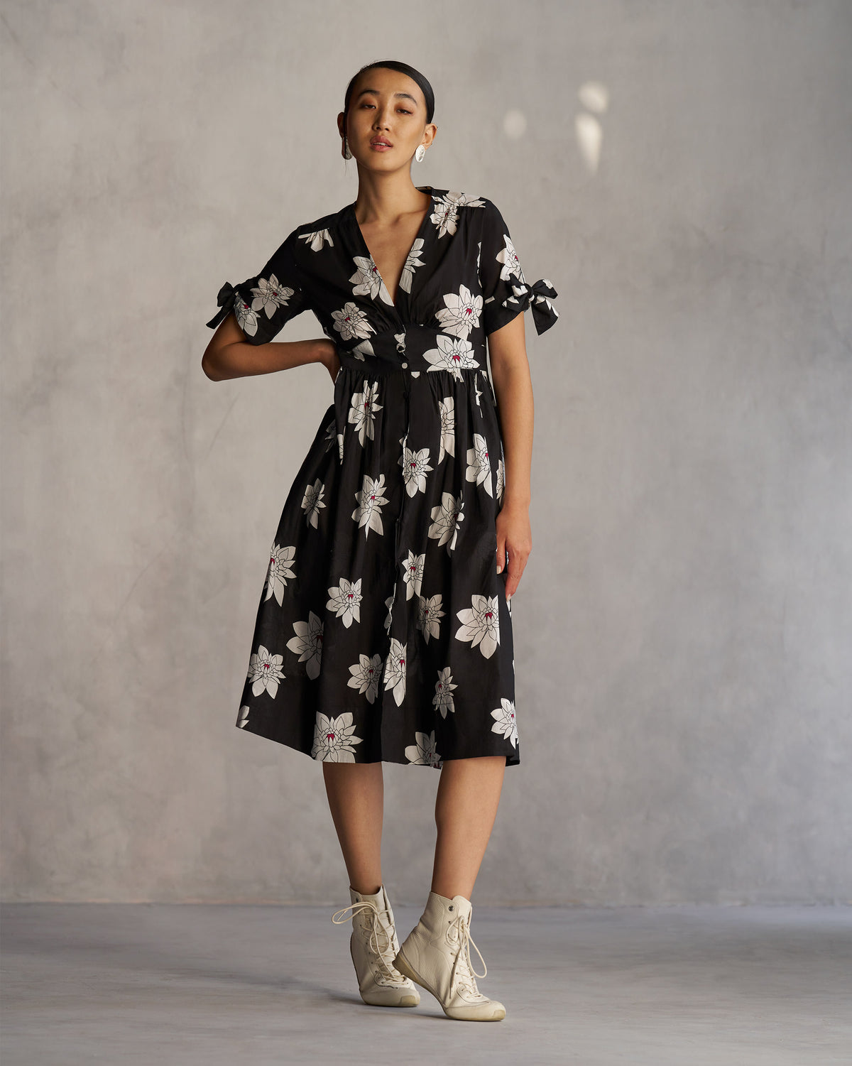 - Our Button Down Dress is pure bliss – romantic, breezy, and sexy as hell. Put it on and feel incredible. It comes with bow-tie sleeves, a v-neck, pockets, and a length that falls just below the knee.