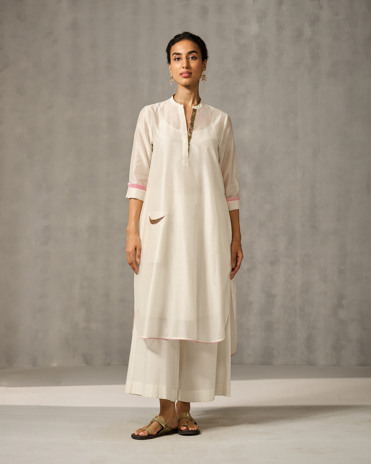 - The Chand Pocket Kurta comes in ivory with an accompanying slip, featuring a gold gota pocket and gota detailing at the underplacket and back collar.
