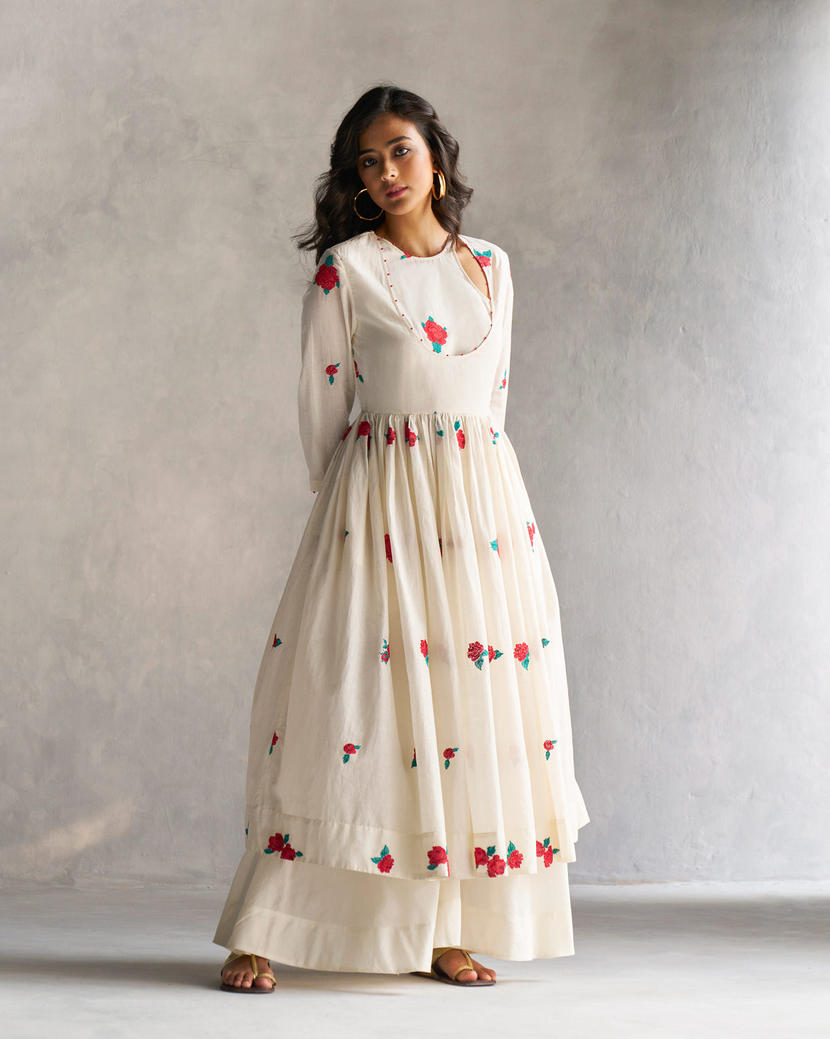 - Step into the festivities with the timeless allure of our Fit & Flare Angrakha in gorgeous ivory. Our Angrakha pays homage to the traditional style with a modern twist. Crafted in cotton korra, our Fit & Flare Angrakha comes with a smattering of rose details all over. The gentle gathers at the waist create a flattering fit, ensuring the perfect twirl.