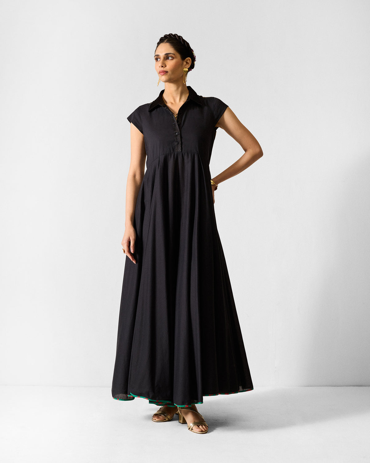 - The Leh Dress is rendered in a deep, solid black with golden checks at the back for a look that’s equal parts effortless and elevated.