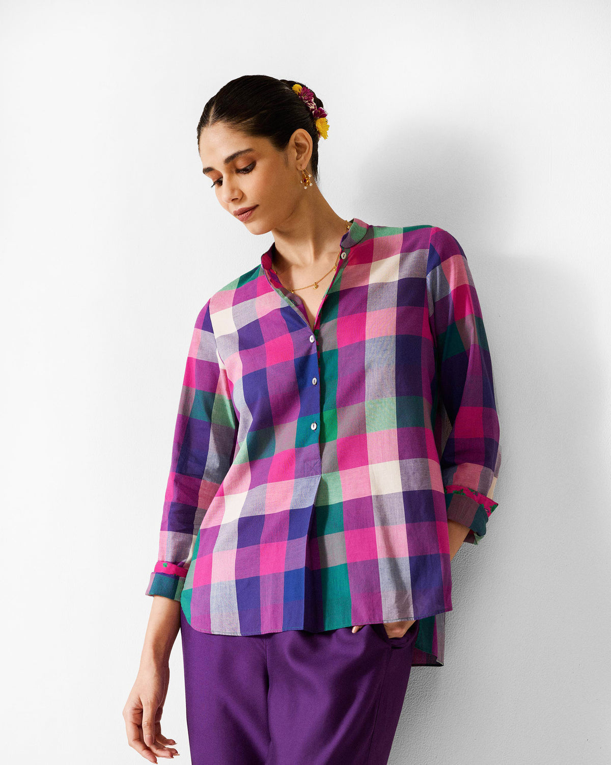 - The vibrant Mandarin Collar Top is designed as a festive staple, combining cheerful multicolour checks with handcrafted embellishments. Perfect for celebrations, it balances playful patterns with elegant detailing.