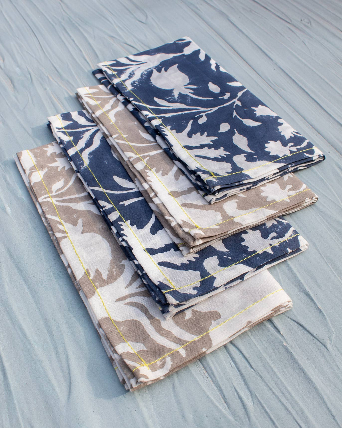 - A set of four hand block printed napkins in opal grey and indigo blue that will complement any table setting.