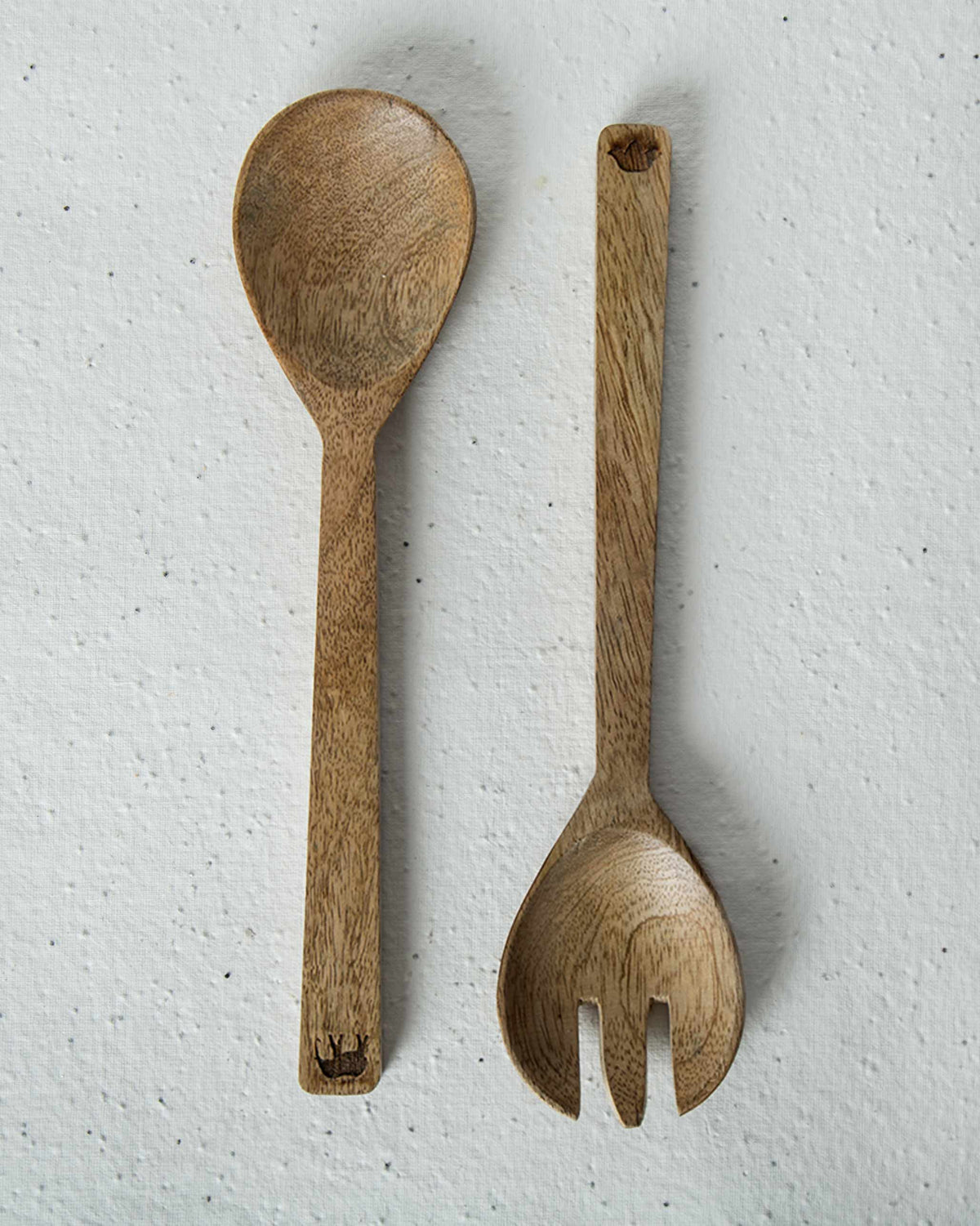 - With etched handles and richly grained wood, these handcrafted servers pair with our wooden salad bowl, but are a welcome addition to any kitchen drawer.