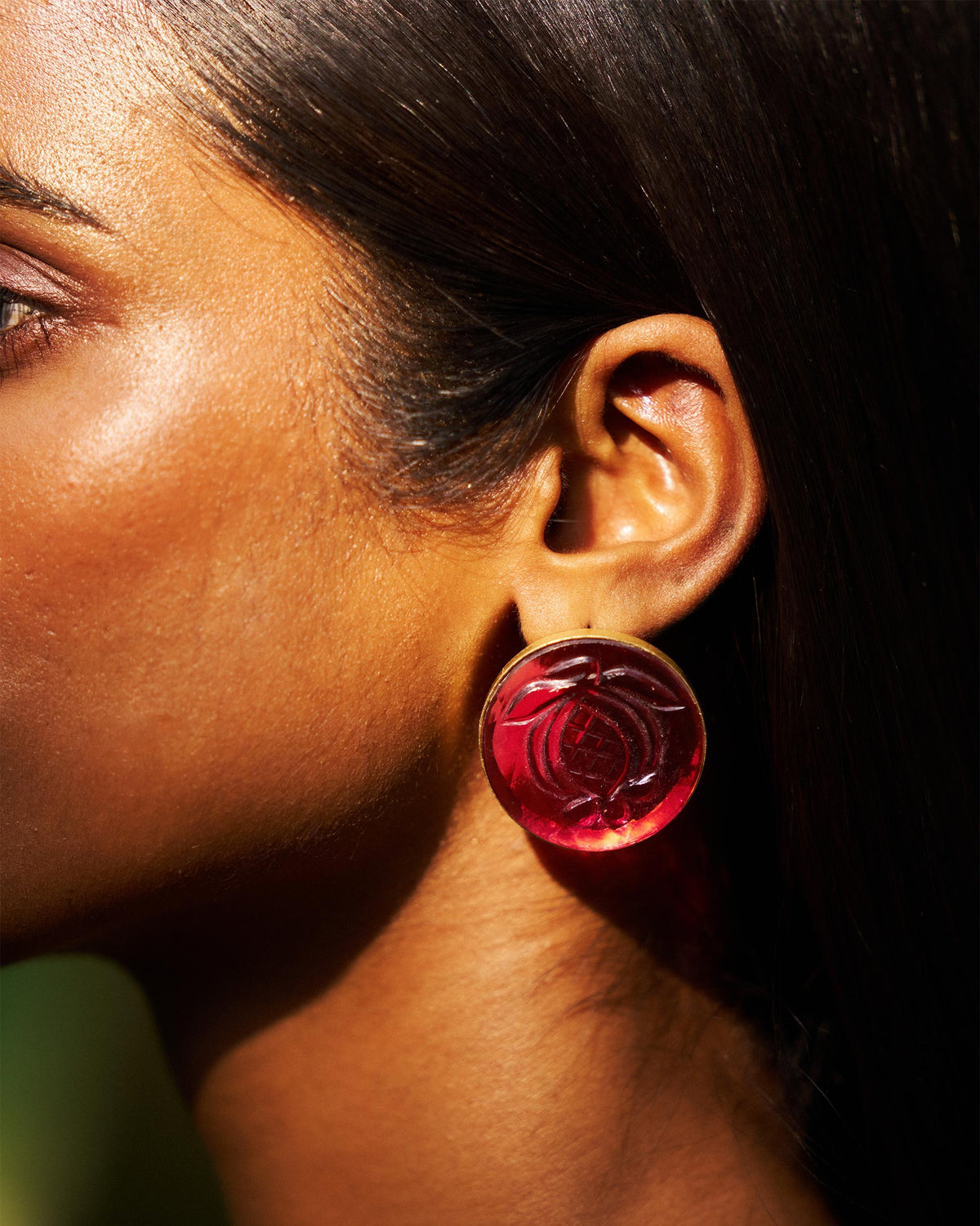 - The large Anar Glass Seal Studs are hand-carved red glass seal studs, crafted in the vibrant streets of Jaipur. Delicate yet bold, they offer a lightweight statement perfect for any occasion.