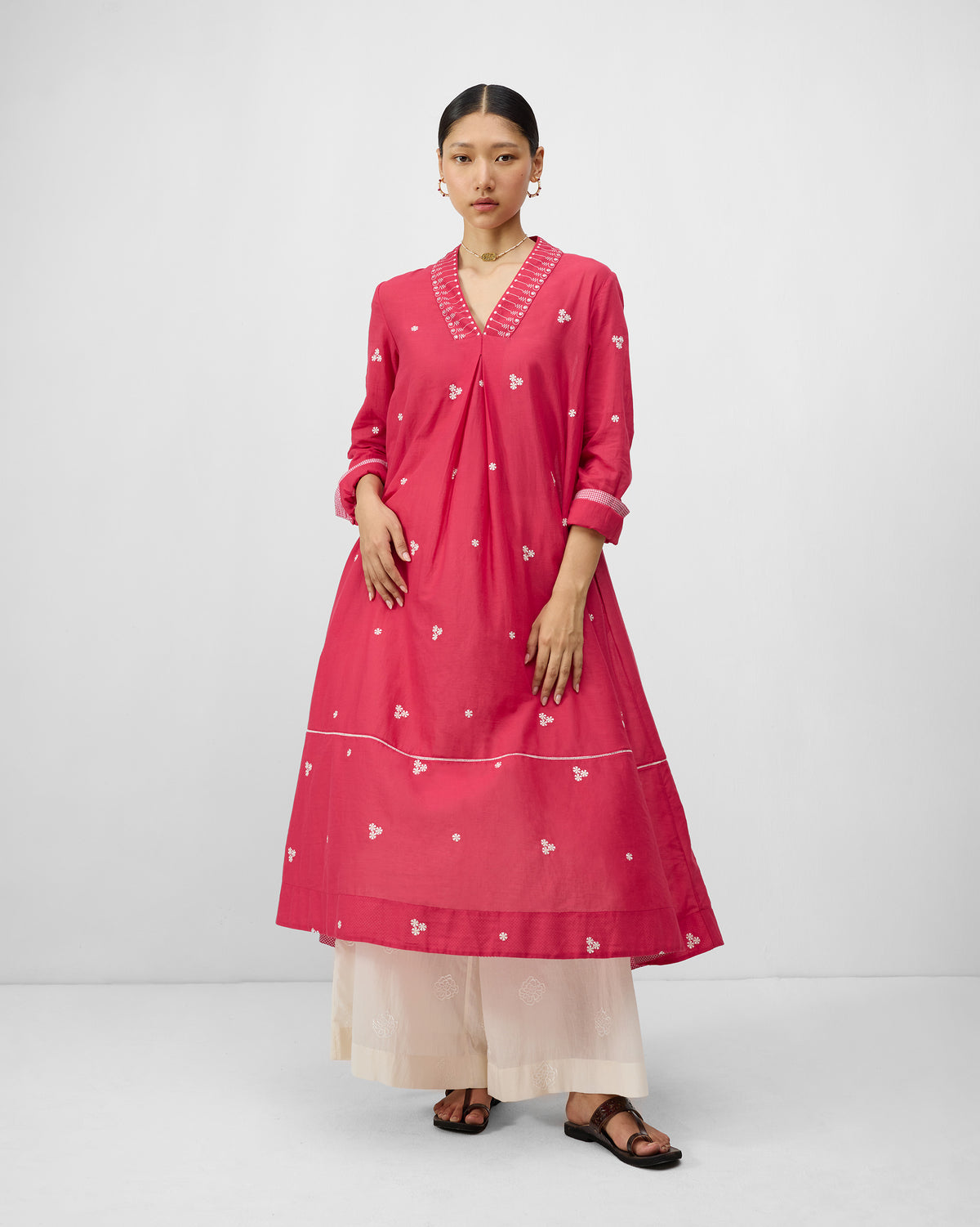 - Cut in deep watermelon pink cotton kora, it features ivory placement embroidery at the neckline and cuffs along with all over embroidery, with subtle silver sequin highlights that catch the light just enough.
