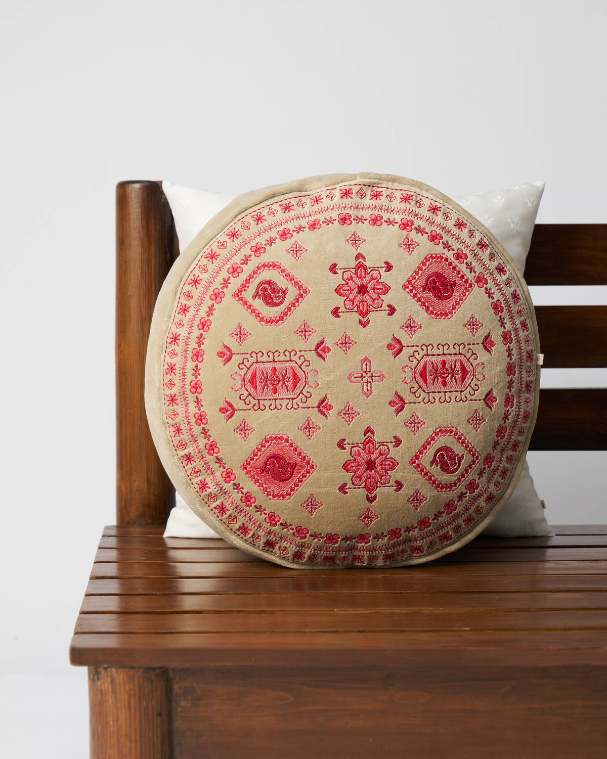 - The Berber Round Cushion Cover features a medley of patterns inspired by our travels embroidered in red that tells tales of Morocco.