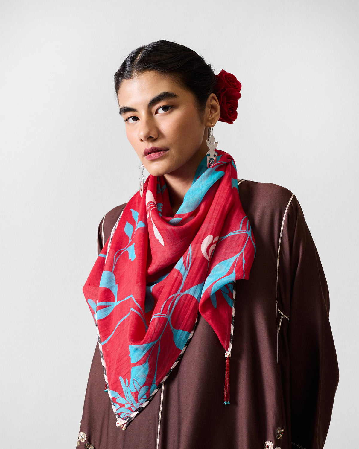 - The Floral Scarf is a striking accent piece, its red base brought to life with teal chrysanthemums and a bold striped border.