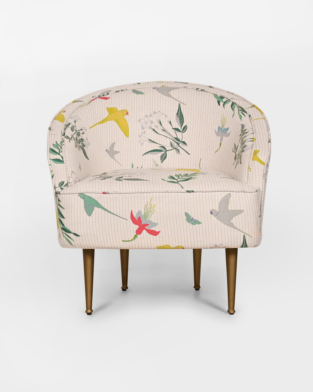 - Set on sleek gold legs, its frame is cast in metal and wrapped in botanical fabric, a riot of flora in full bloom, upholstered in soft, durable polylinen.