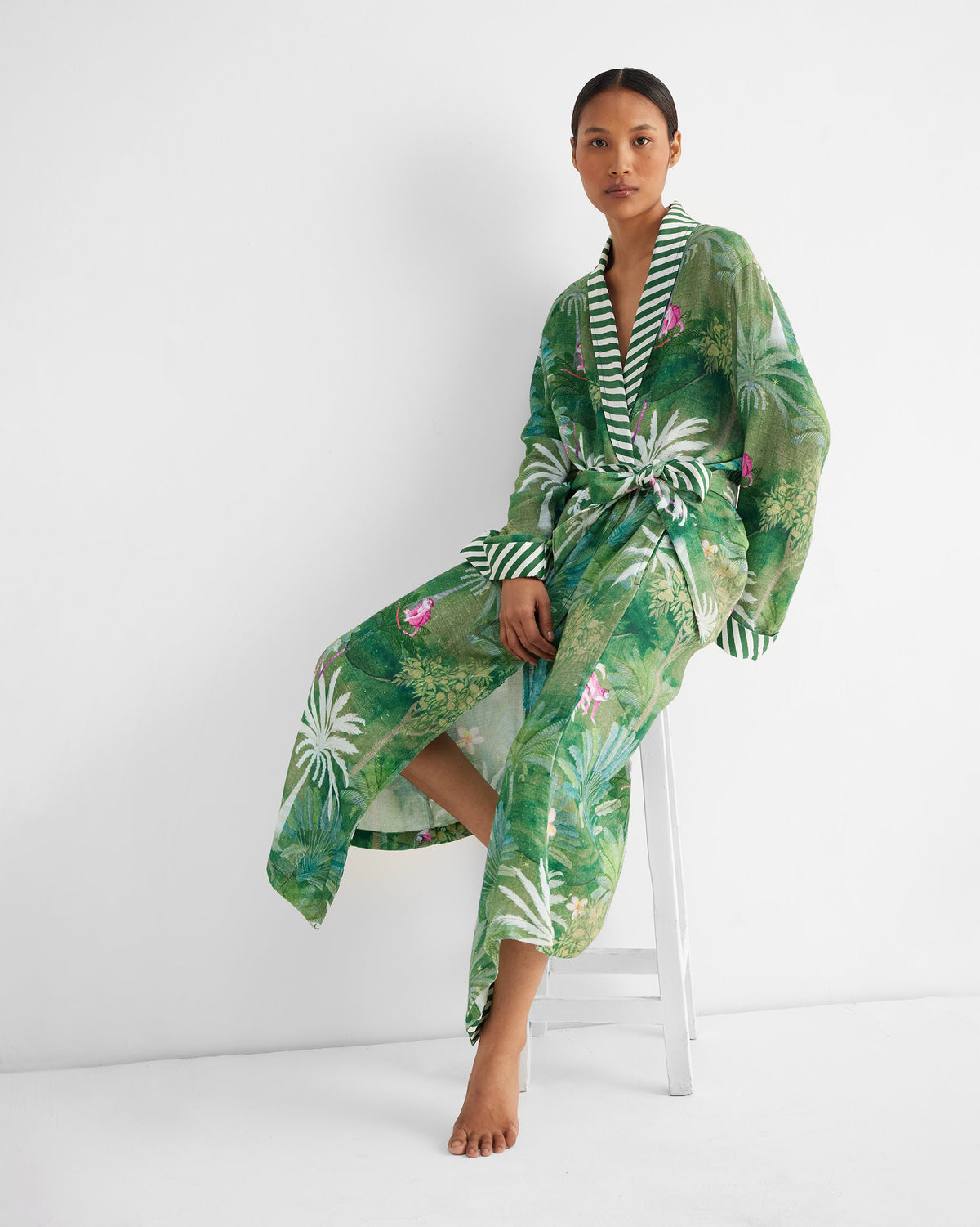 - The digi-printed dressing robe features delightful green stripes along the collar, cuffs and tie.