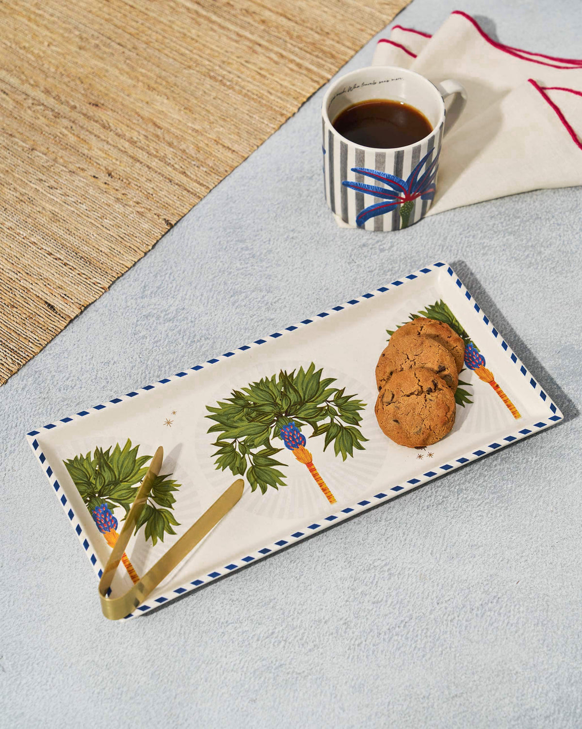 - Abundant palm motifs from Morocco come alive with the Desert Trail Cookie Tray in a tranquil colour palette. The accompanying tong makes serving effortless.