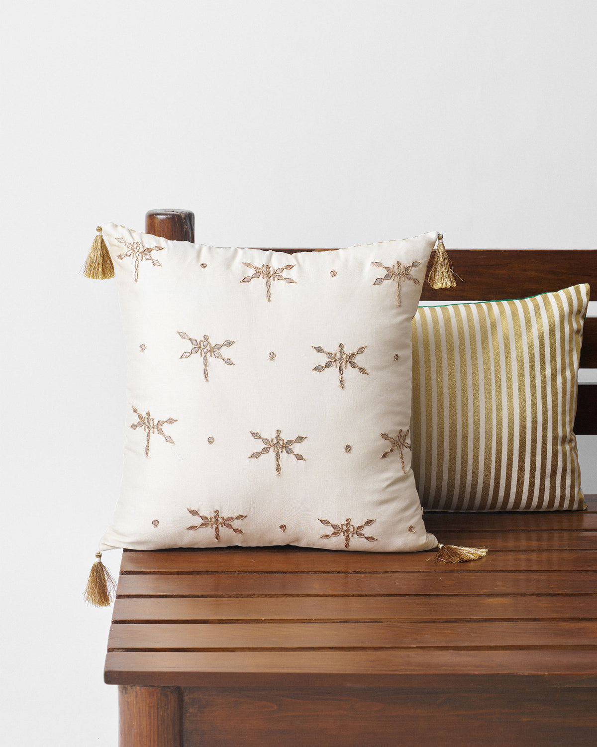 - The Dragonfly Dream Cushion Cover is a celebration of craft, with delicate dragonflies brought to life in shimmering gota patti on an ivory base.