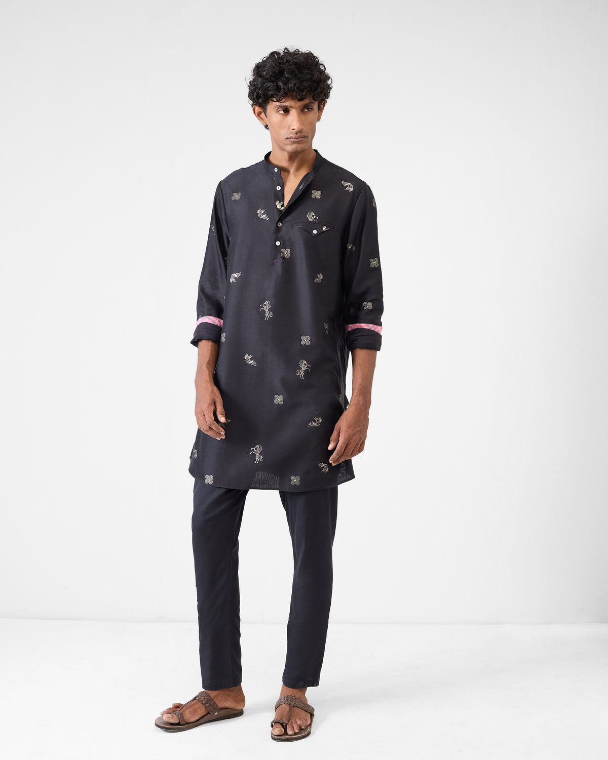 - The charcoal-toned kurta features all-over silver foil detailing that brings a quiet gleam to celebratory dressing.